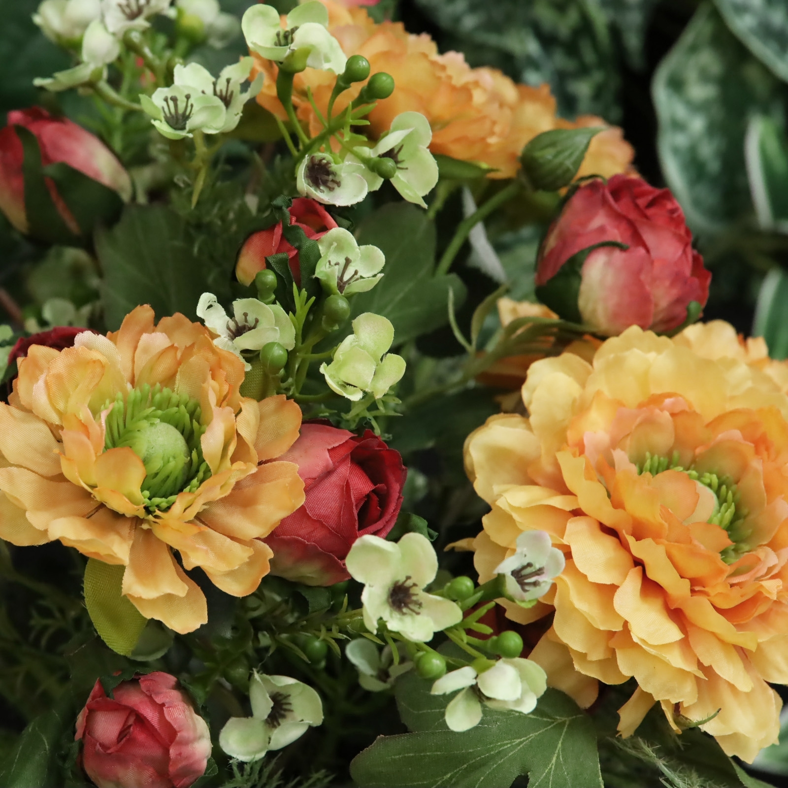 Il bouquet artificiale legato a mano Frieda Bern, alto 35 cm e largo 30 cm, è una composizione affascinante e colorata di fiori artificiali nei toni caldi dell’arancione, arricchita da eleganti accenti rossi. Questo compatto bouquet artificiale trasmette subito calore ed eleganza ed è stato accuratamente realizzato a mano da fioristi esperti. I suoi fiori vivaci e il fogliame fresco lo rendono il centro perfetto per un tavolo da pranzo, una credenza, un tavolino o come dettaglio raffinato in una hall o in ufficio. Attenzione: il Vaso in porcellana Madelief 14x20 cm verde mostrato non è incluso.
