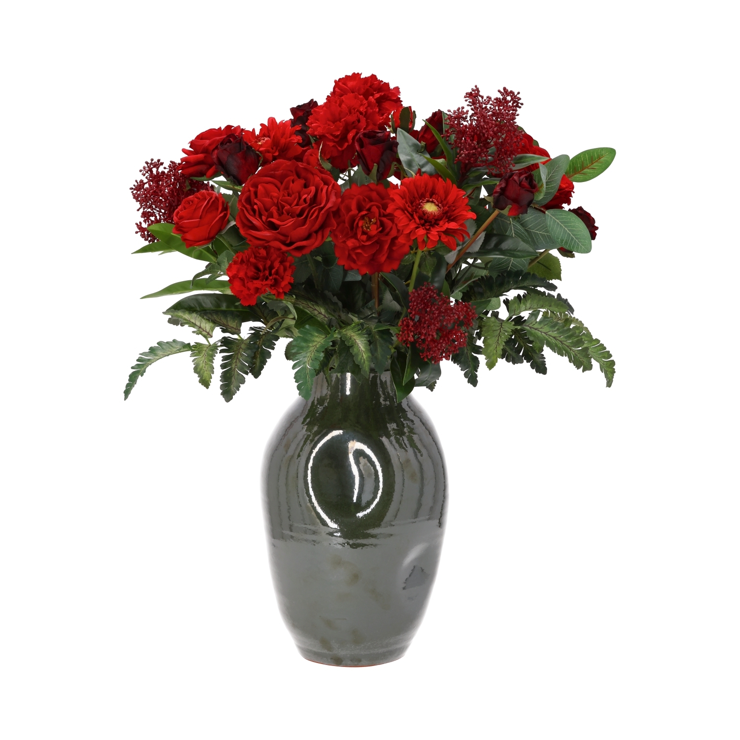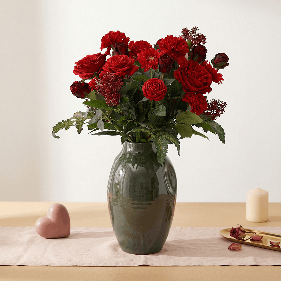 Il Mazzo di Fiori Artificiali Valentina Ravello legato a mano è un mazzo elegante e di grande impatto con un’altezza di 55 cm e una larghezza di circa 45 cm. Questo mazzo artificiale di lusso si distingue per le sue intense tonalità rosse e per la composizione ricca e armoniosa. Il mazzo comprende, tra gli altri fiori, rose, gerbere e garofani dall’aspetto realistico, abbinati a verde decorativo come eucalipto e foglie di felce. I fiori sono realizzati in seta artificiale di alta qualità, rendendo questo mazzo di fiori in seta bello come quello naturale ma completamente privo di manutenzione.
