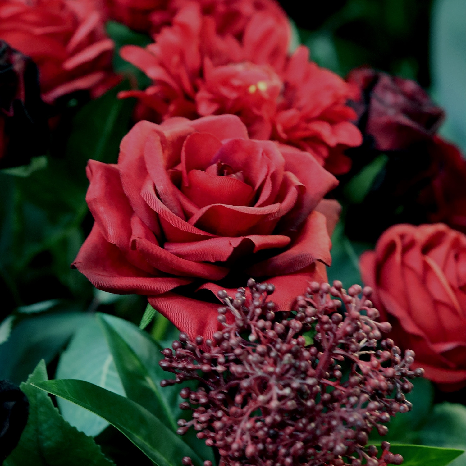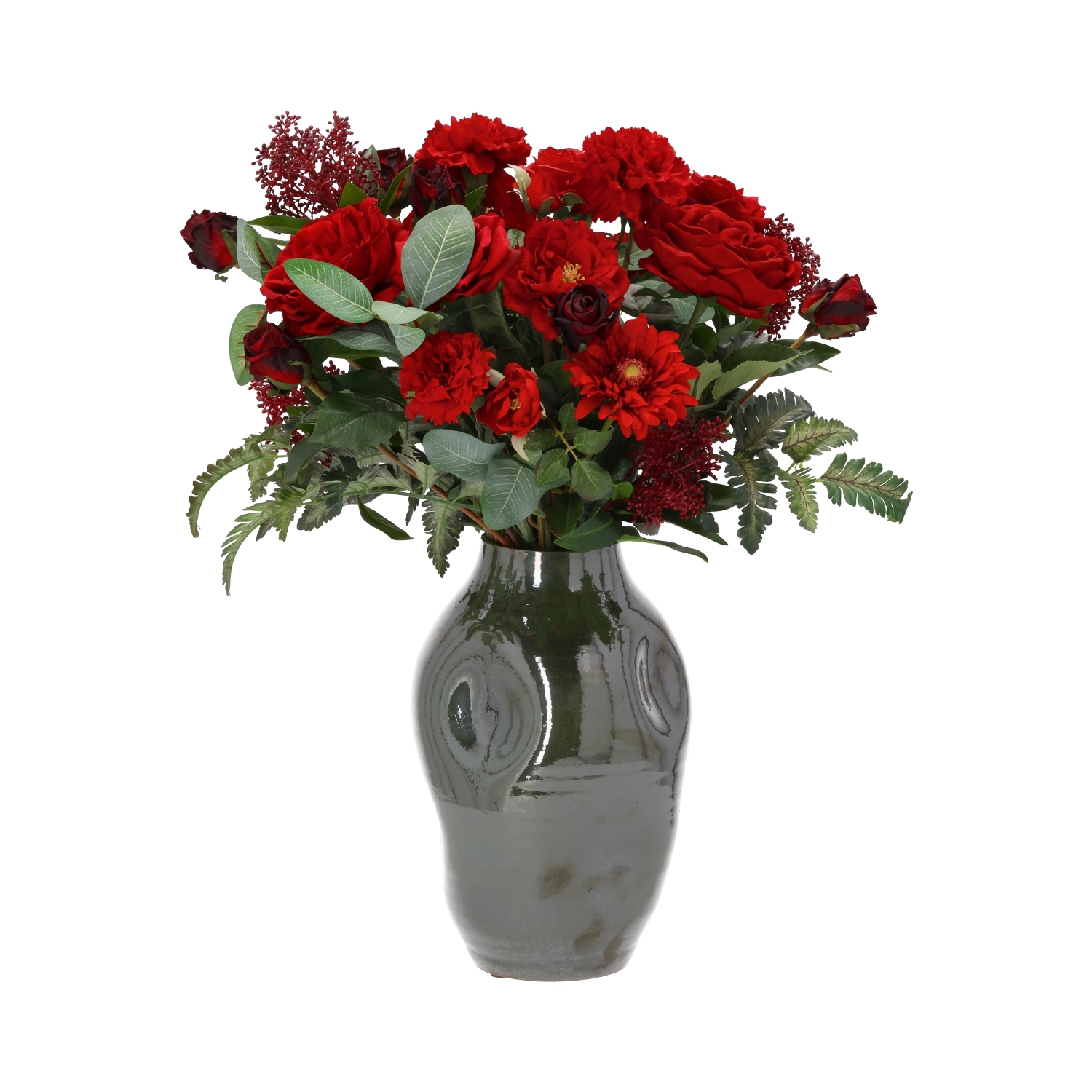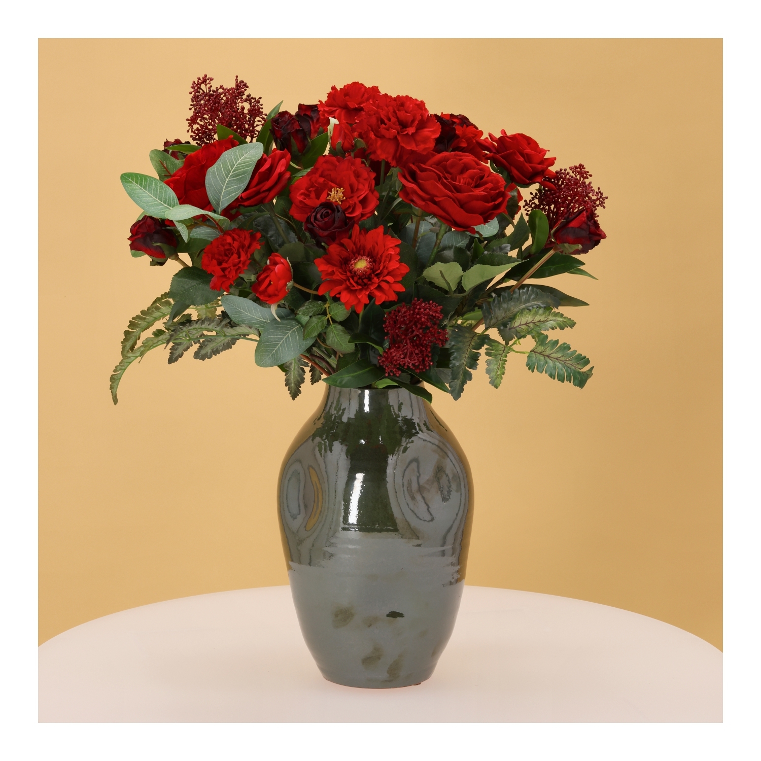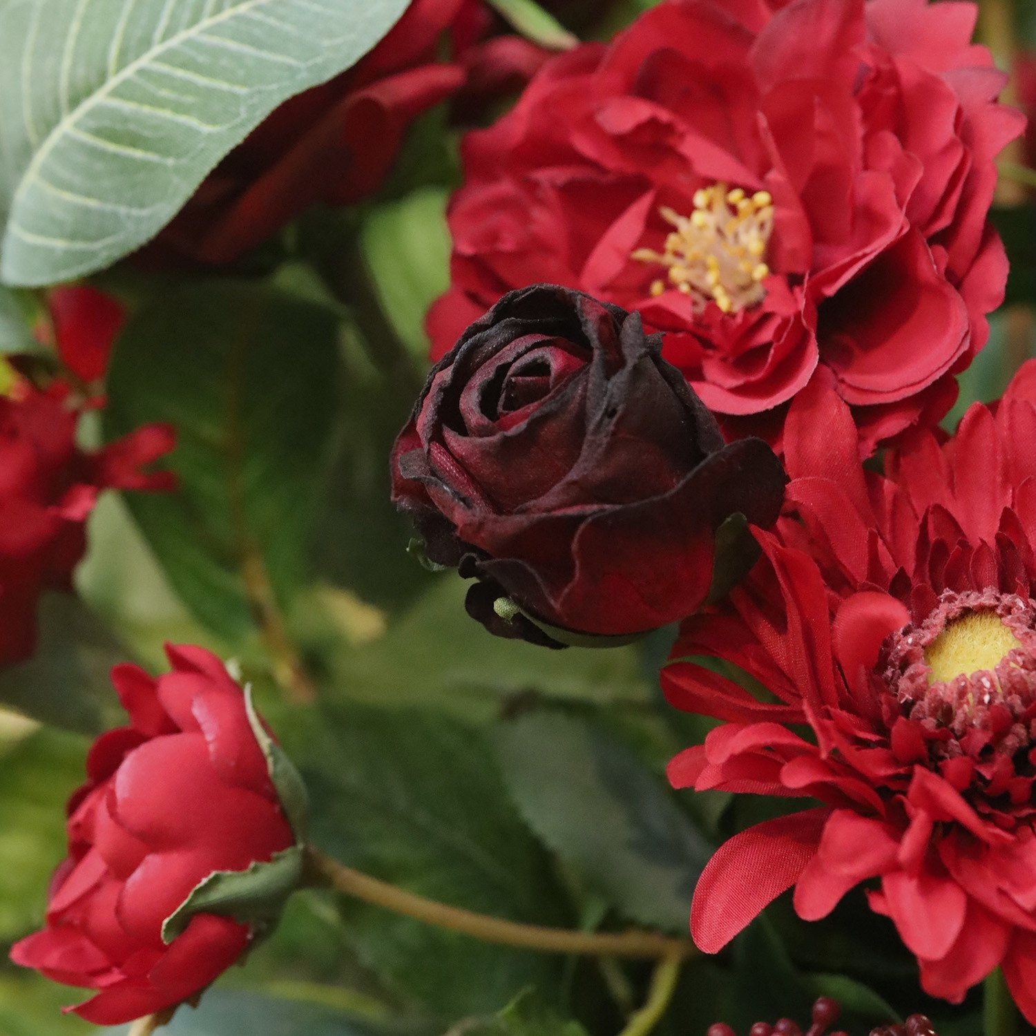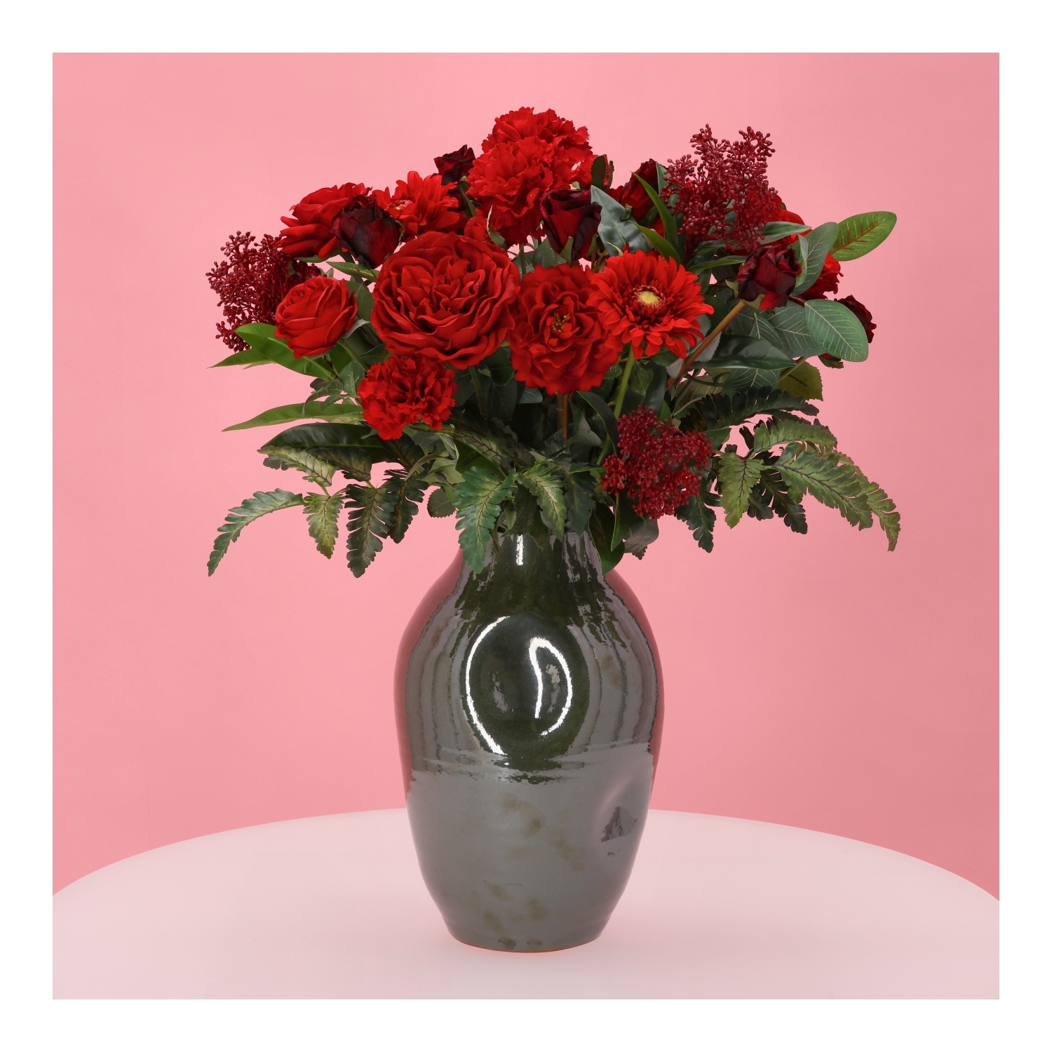 Il Mazzo di Fiori Artificiali Valentina Ravello legato a mano è un mazzo elegante e di grande impatto con un’altezza di 55 cm e una larghezza di circa 45 cm. Questo mazzo artificiale di lusso si distingue per le sue intense tonalità rosse e per la composizione