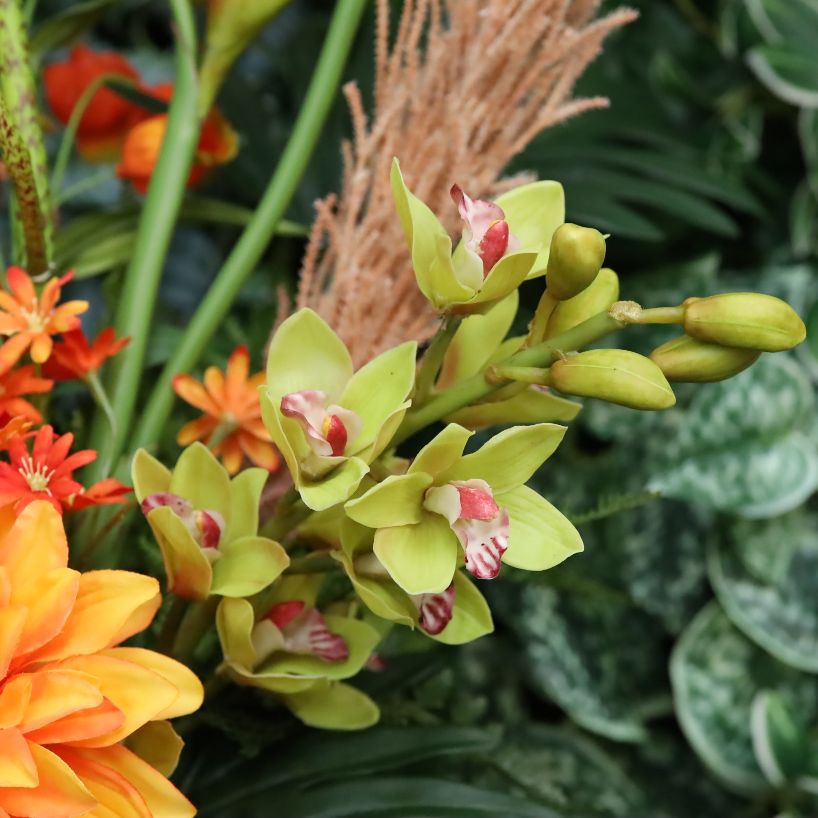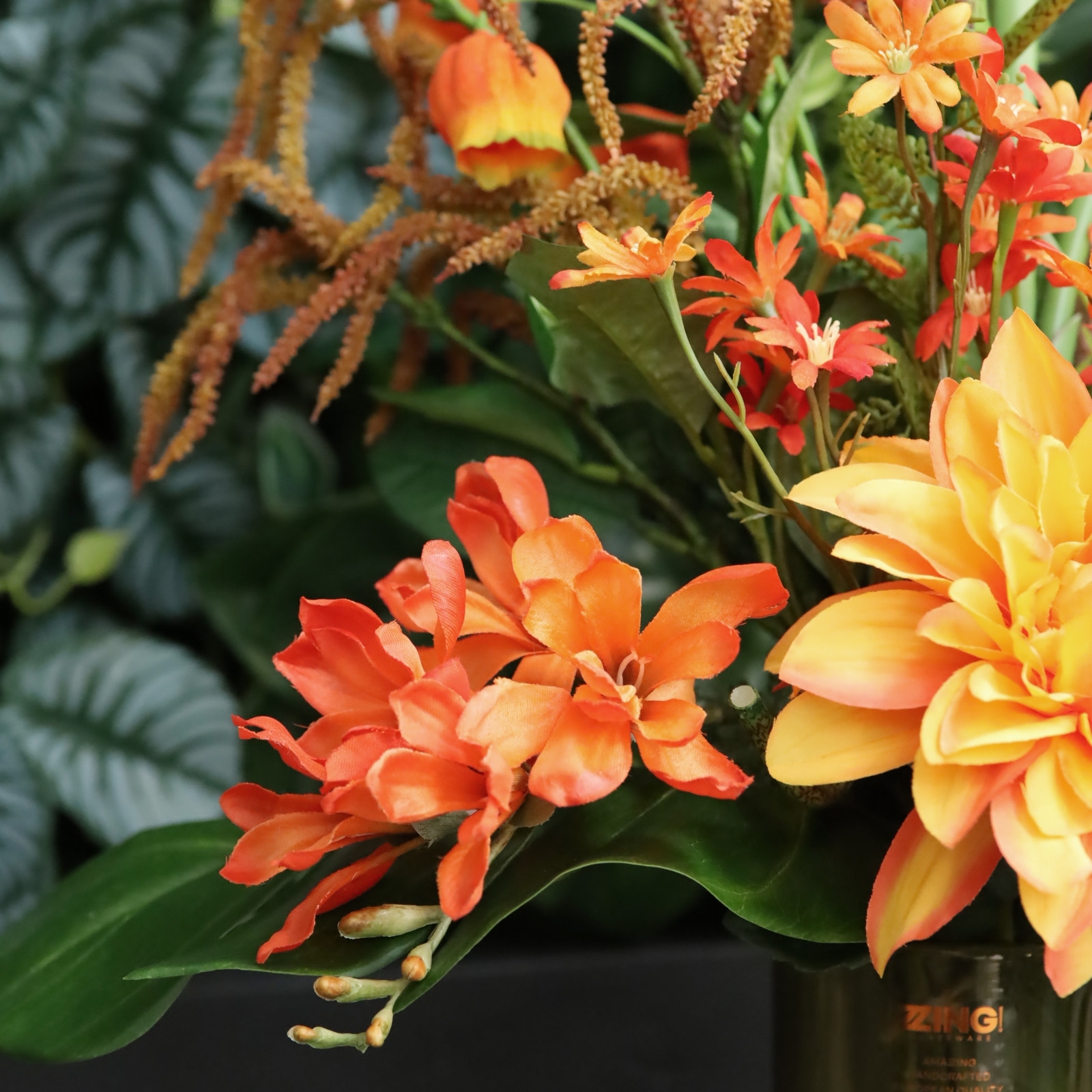 Il Mazzo di Fiori Artificiali Legato a Mano Oriana Palermo, alto 80 cm e largo 45 cm, è una composizione lussuosa di fiori artificiali nei caldi toni arancioni. Creato con cura da esperti fioristi, questo mazzo artificiale trasmette eleganza e naturalezza, div
