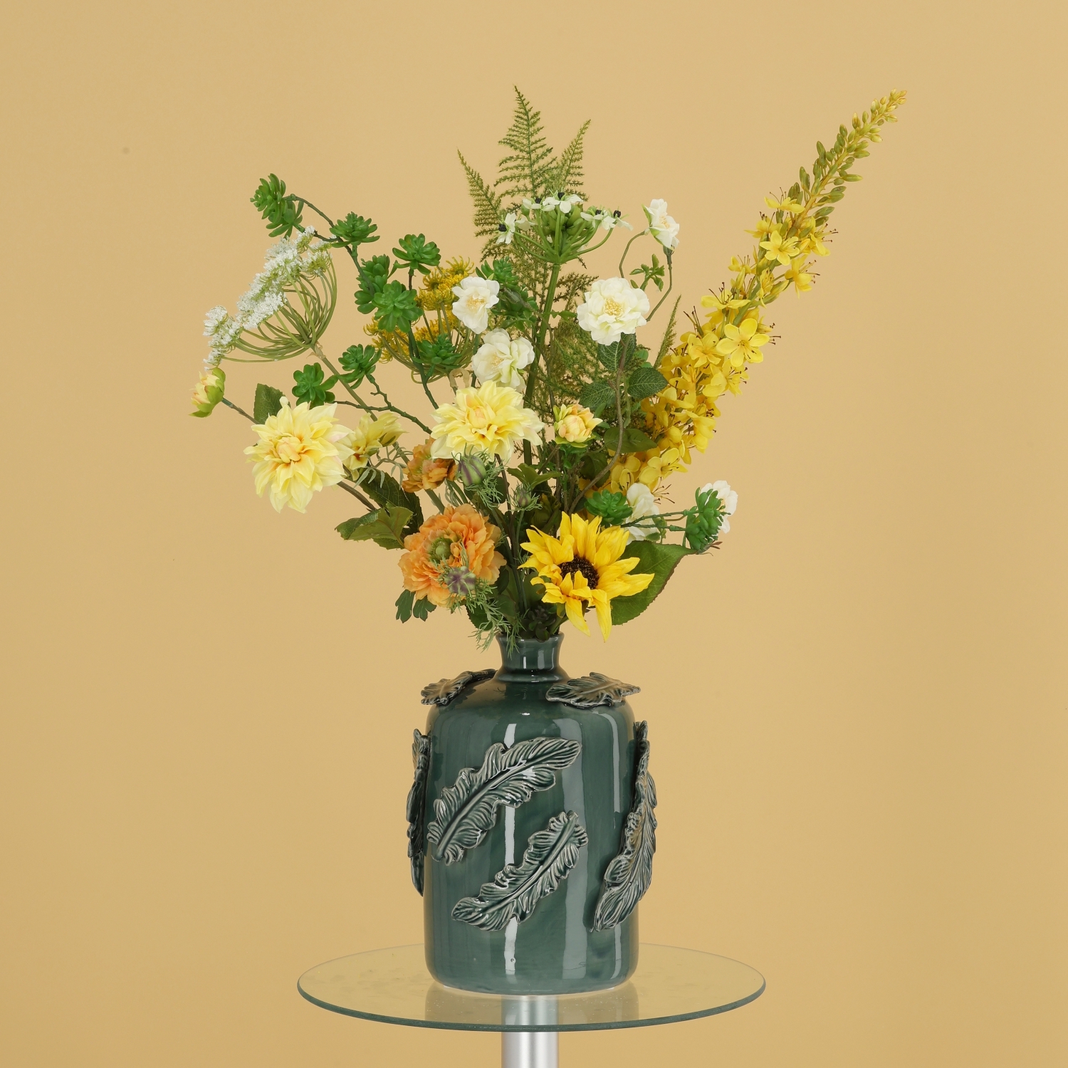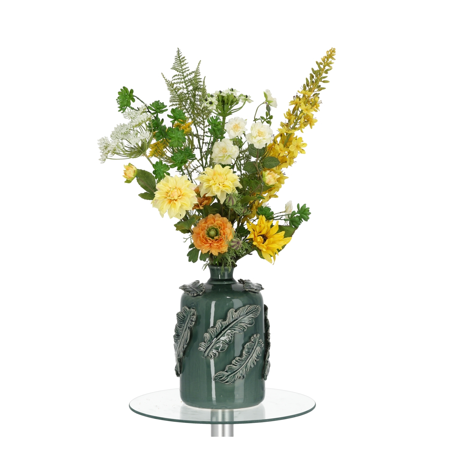 Il bouquet è legato a mano con cura dai nostri fioristi esperti. Realizzato con materiali di alta qualità, è quasi indistinguibile da un bouquet naturale e mantiene la sua bellezza per anni. Perfetto su tavoli da pranzo, buffet, tavolini del soggiorno o come elemento centrale all’ingresso o sulla reception di un ufficio. Il bouquet risalta particolarmente se abbinato al Vaso in ceramica Foglie D21xH30 verde, che valorizza i suoi colori e forme. Attenzione: il bouquet viene fornito senza il vaso!