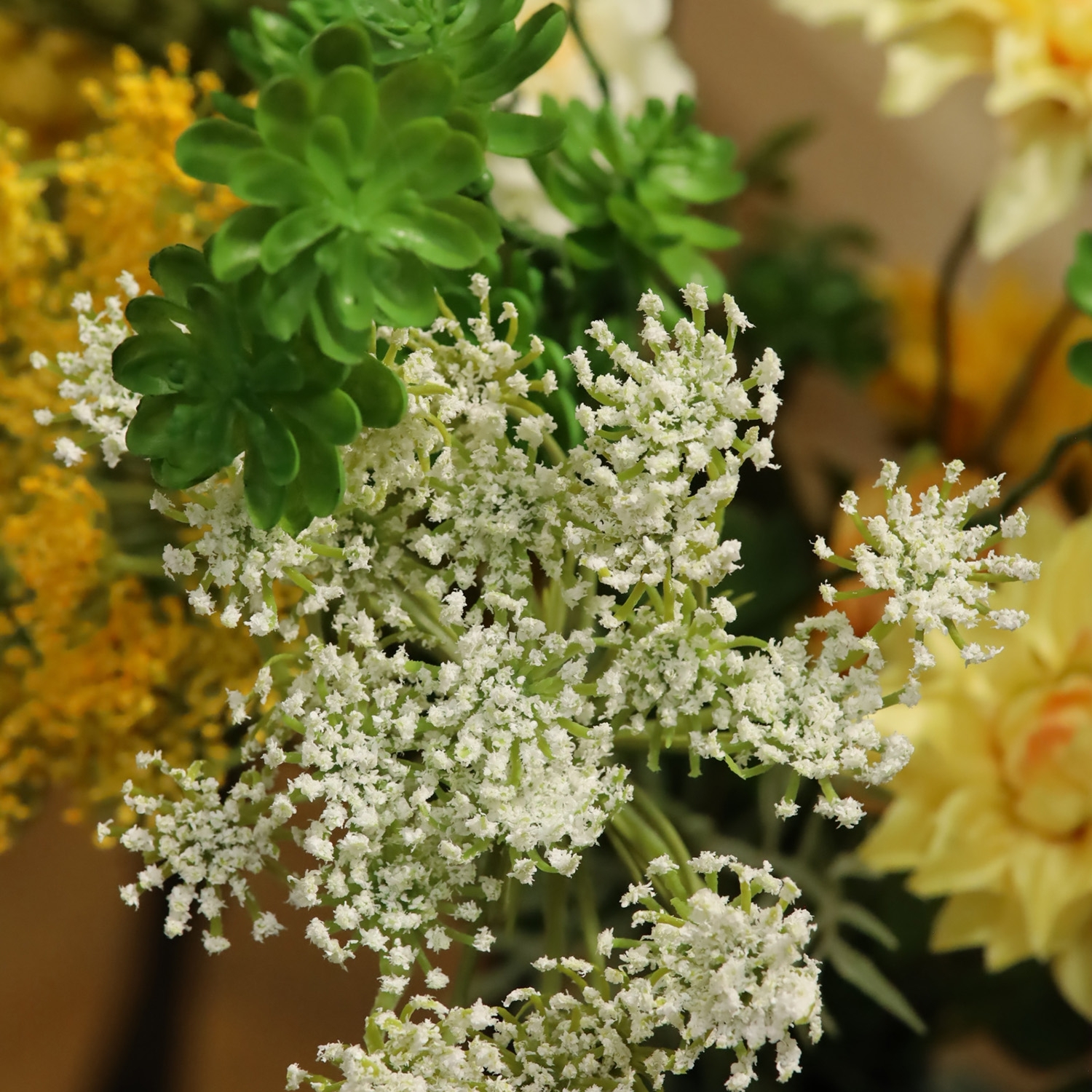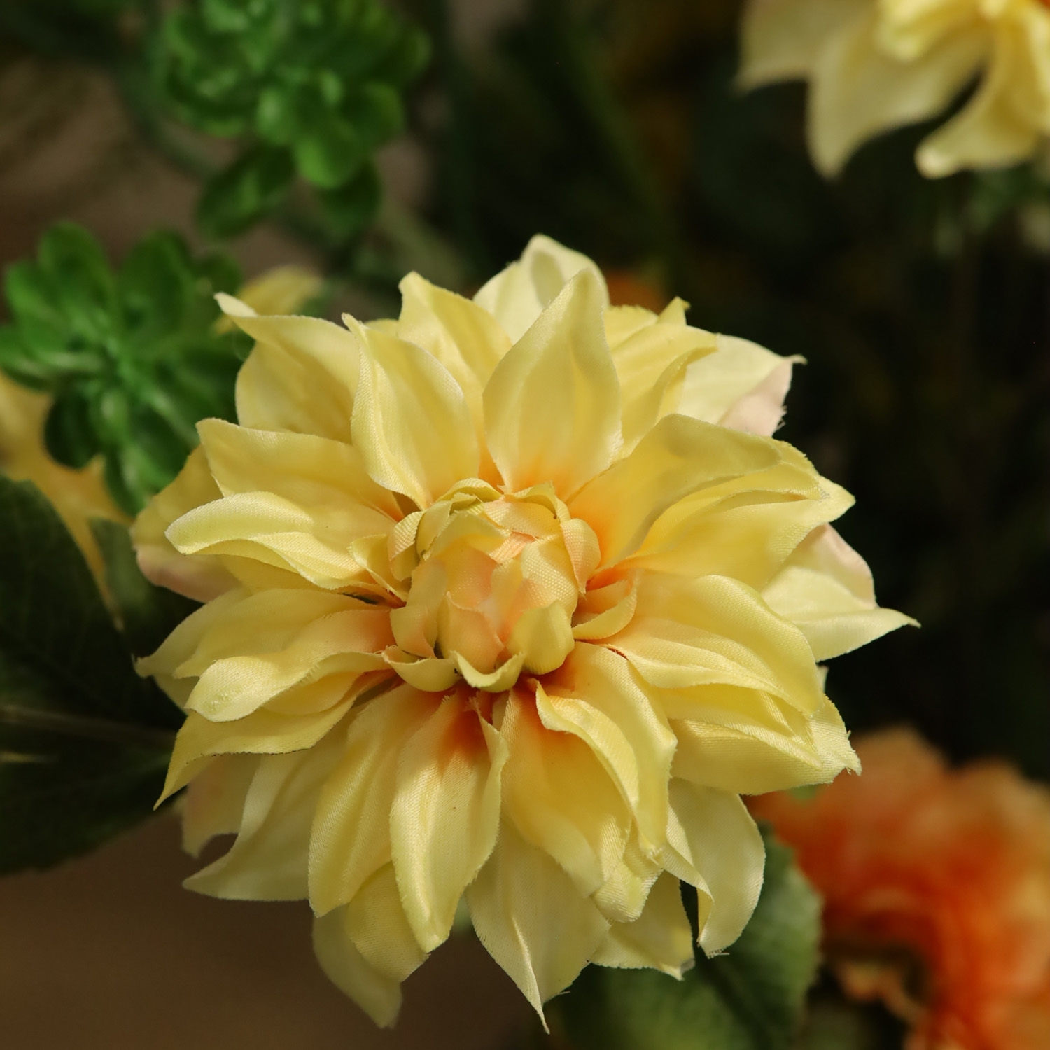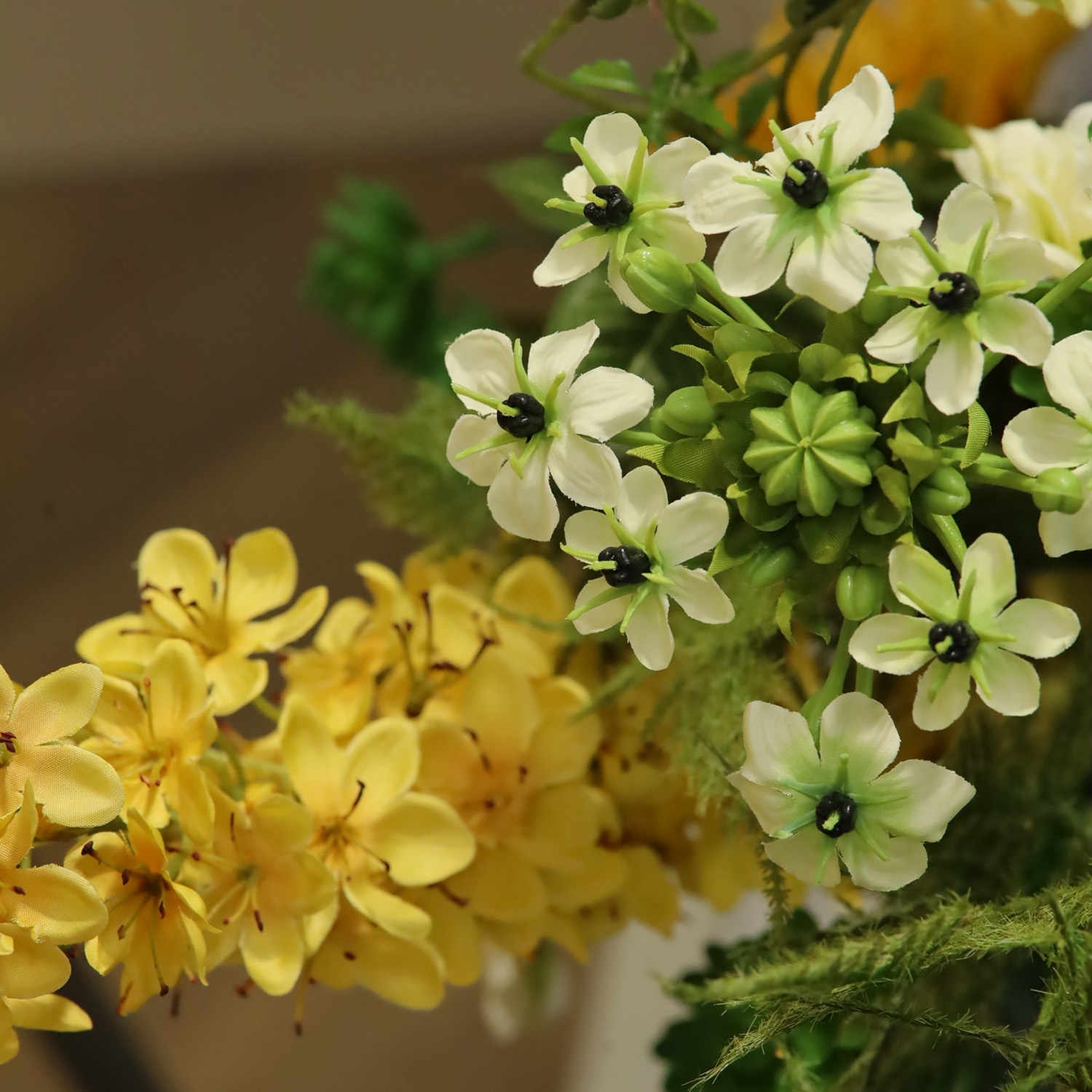 Il Bouquet Artificiale Legato a Mano Vivianne Florence – Giallo/Verde è un elemento elegante e naturale per qualsiasi ambiente. Grazie alla sua armoniosa combinazione di giallo vibrante e verde fresco, questo bouquet artificiale porta immediatamente un’atmosfera calda e solare. Le delicate transizioni cromatiche, le diverse strutture delle foglie e le forme floreali donano un aspetto raffinato e realistico che valorizza ogni spazio.