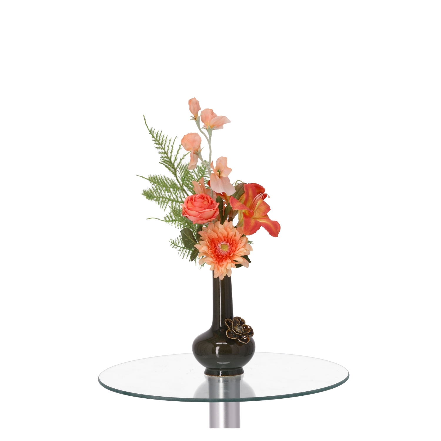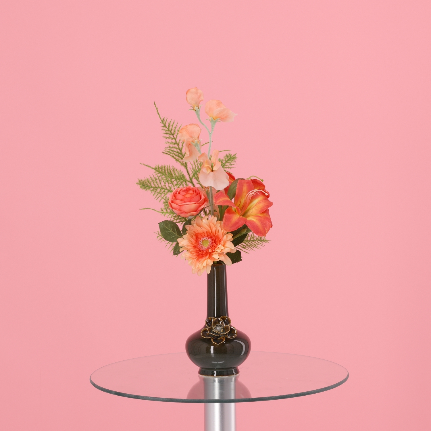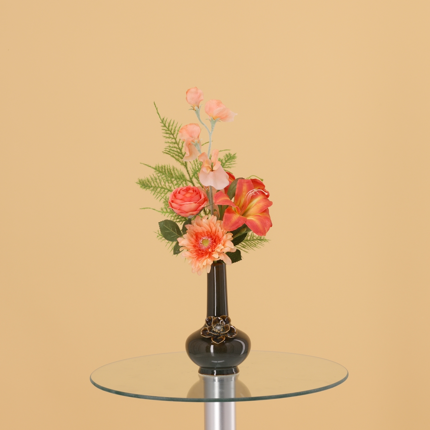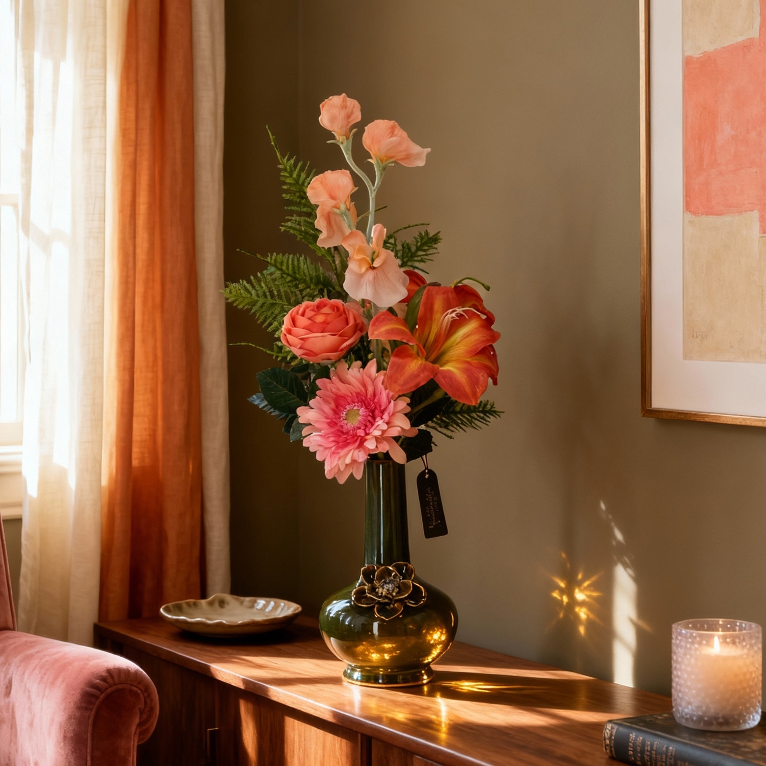 Il Mazzo di Fiori Artificiali Legato a Mano Aria Venezia, alto 45 cm e largo 20 cm, è una composizione elegante di fiori artificiali in una calda tonalità arancione. Questo raffinato mazzo artificiale è stato accuratamente realizzato da fioristi esperti e dona immediatamente atmosfera e raffinatezza a qualsiasi ambiente. Grazie alle sue dimensioni compatte, si adatta perfettamente a un tavolo da pranzo, una credenza, un tavolino o come elemento decorativo in una hall o in un ufficio. La finitura realistica e il colore intenso lo rendono un’aggiunta sobria ma sorprendente a qualsiasi arredamento. Nota: il Vaso Brigitte 10x10x17cm verde mostrato non è incluso.