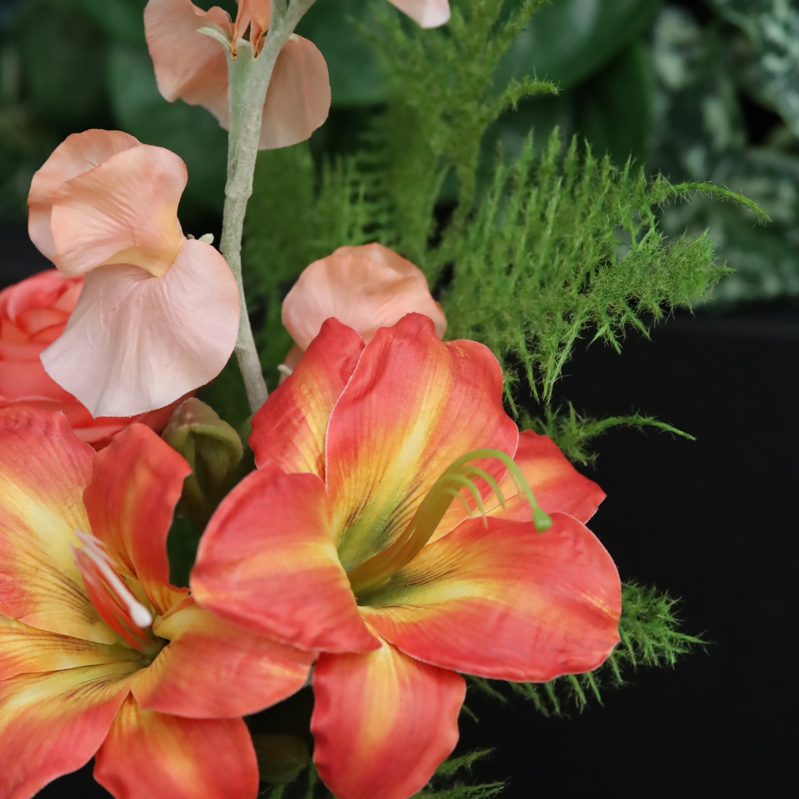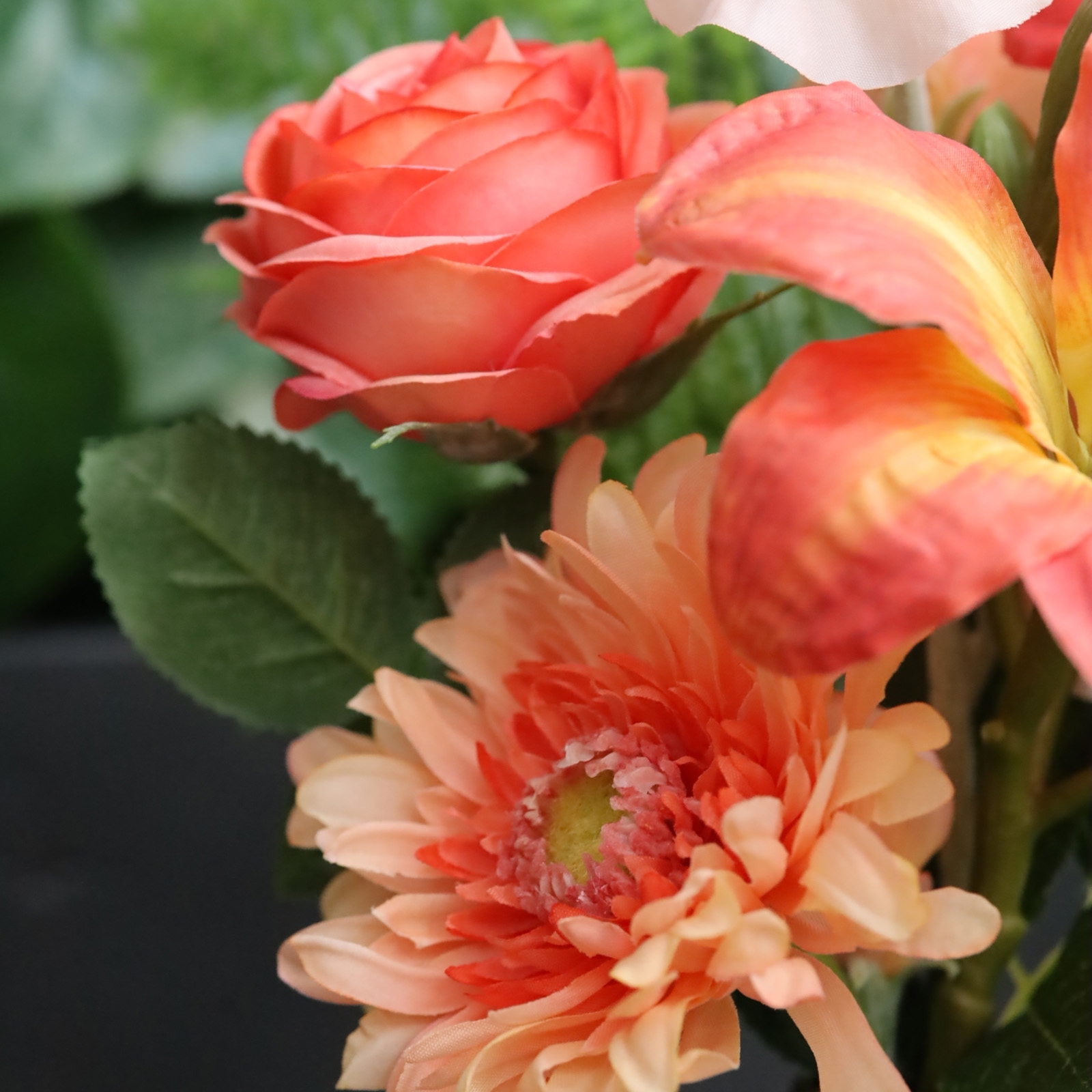 Il Mazzo di Fiori Artificiali Legato a Mano Aria Venezia, alto 45 cm e largo 20 cm, è una composizione elegante di fiori artificiali in una calda tonalità arancione. Questo raffinato mazzo artificiale è stato accuratamente realizzato da fioristi esperti e dona