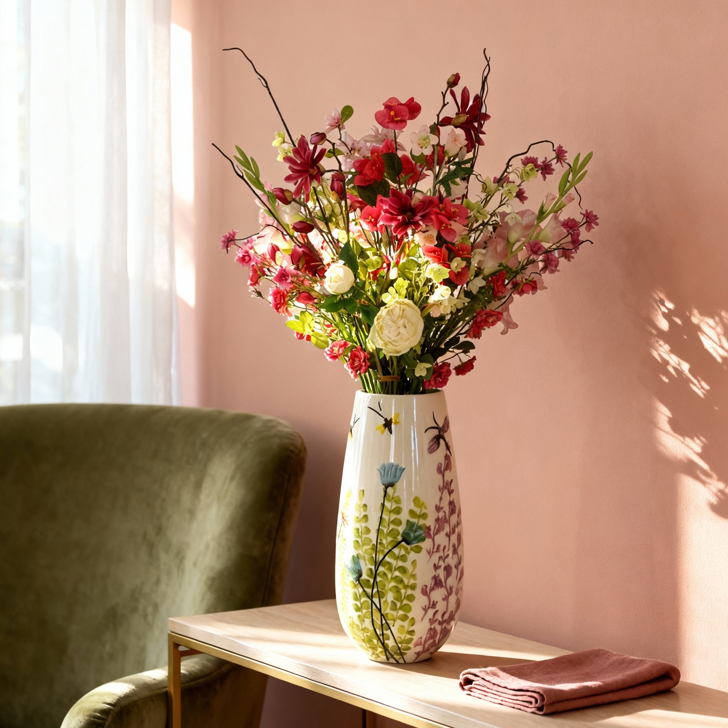 Questo mazzo di fiori artificiali legato a mano rappresenta il perfetto equilibrio tra bellezza naturale e praticità. Realizzato con materiali di alta qualità, è quasi indistinguibile dai fiori veri e mantiene il suo colore e la sua forma per molti anni senza appassire. La selezione accurata di fiori e rami dona al mazzo un aspetto lussuoso ma al tempo stesso accessibile, adatto a diversi stili di arredamento – dal moderno e minimalista al caldo e accogliente. Totalmente senza manutenzione, permette di godere di fiori sempre freschi tutto l’anno.