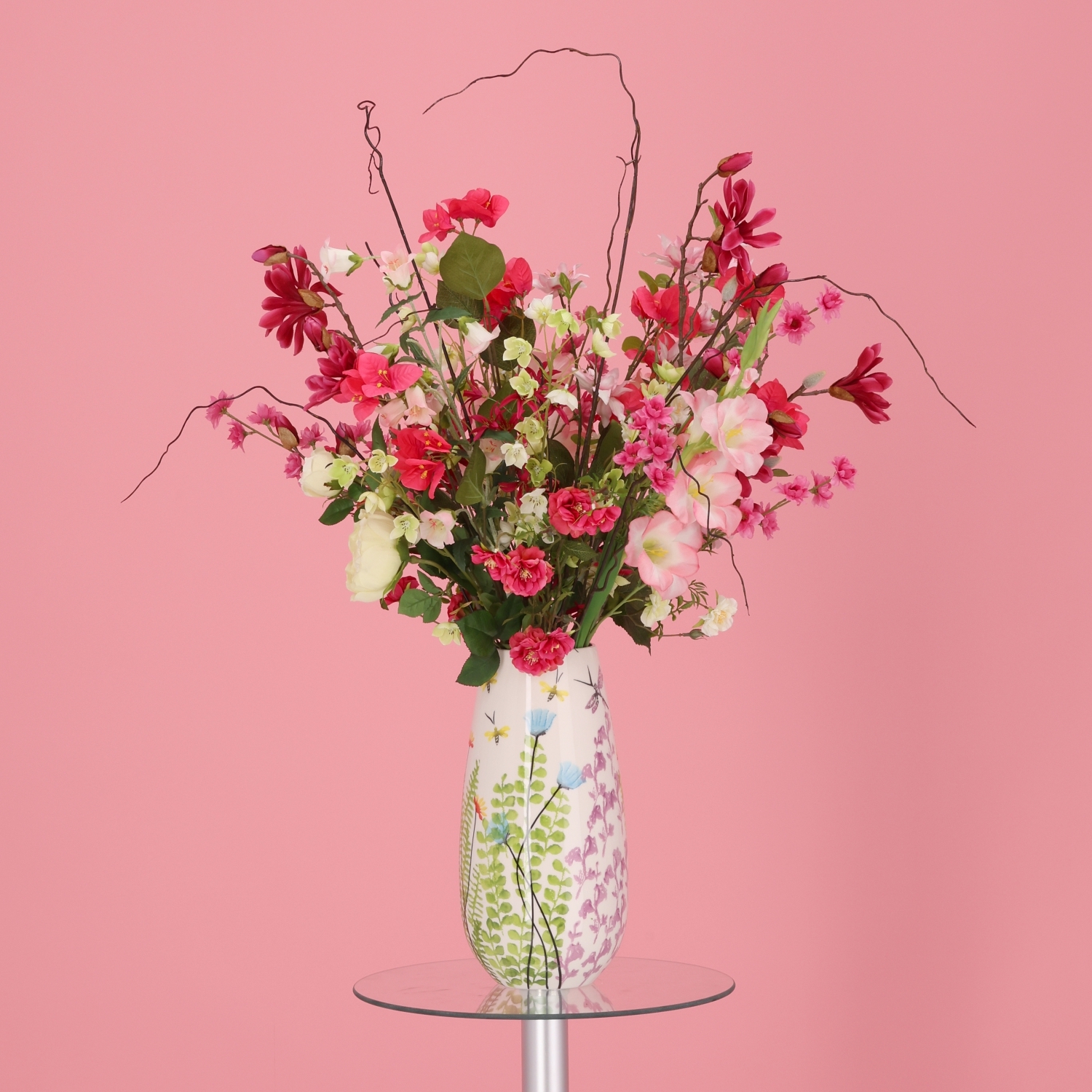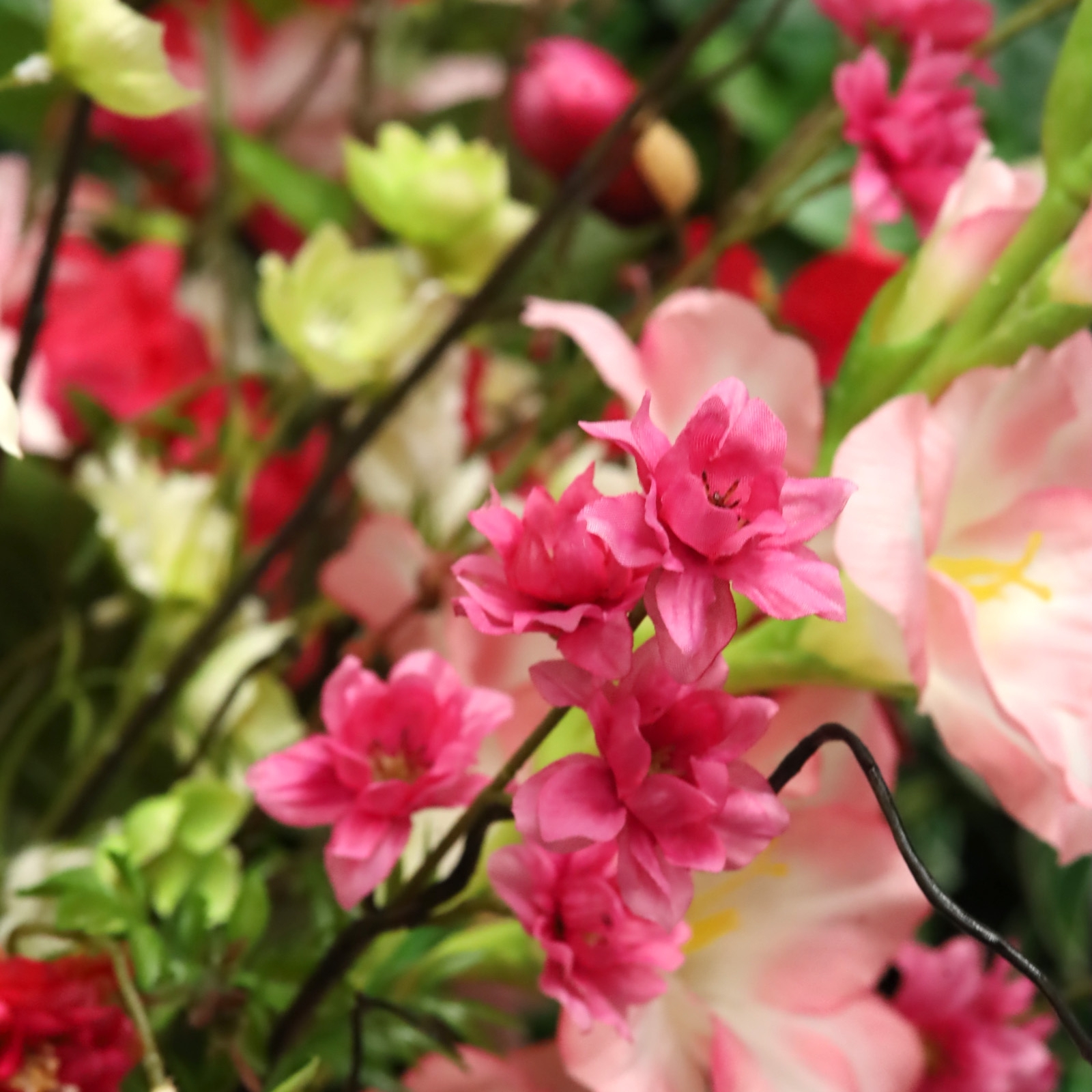 Il Mazzo di Fiori Artificiali Legato a Mano Ella Vienna di 90 cm di altezza e 65 cm di larghezza è una composizione lussuosa e vivace di fiori artificiali in delicate tonalità rosa, arricchite da tocchi di rosso, bianco e verde. Questo generoso mazzo artificia
