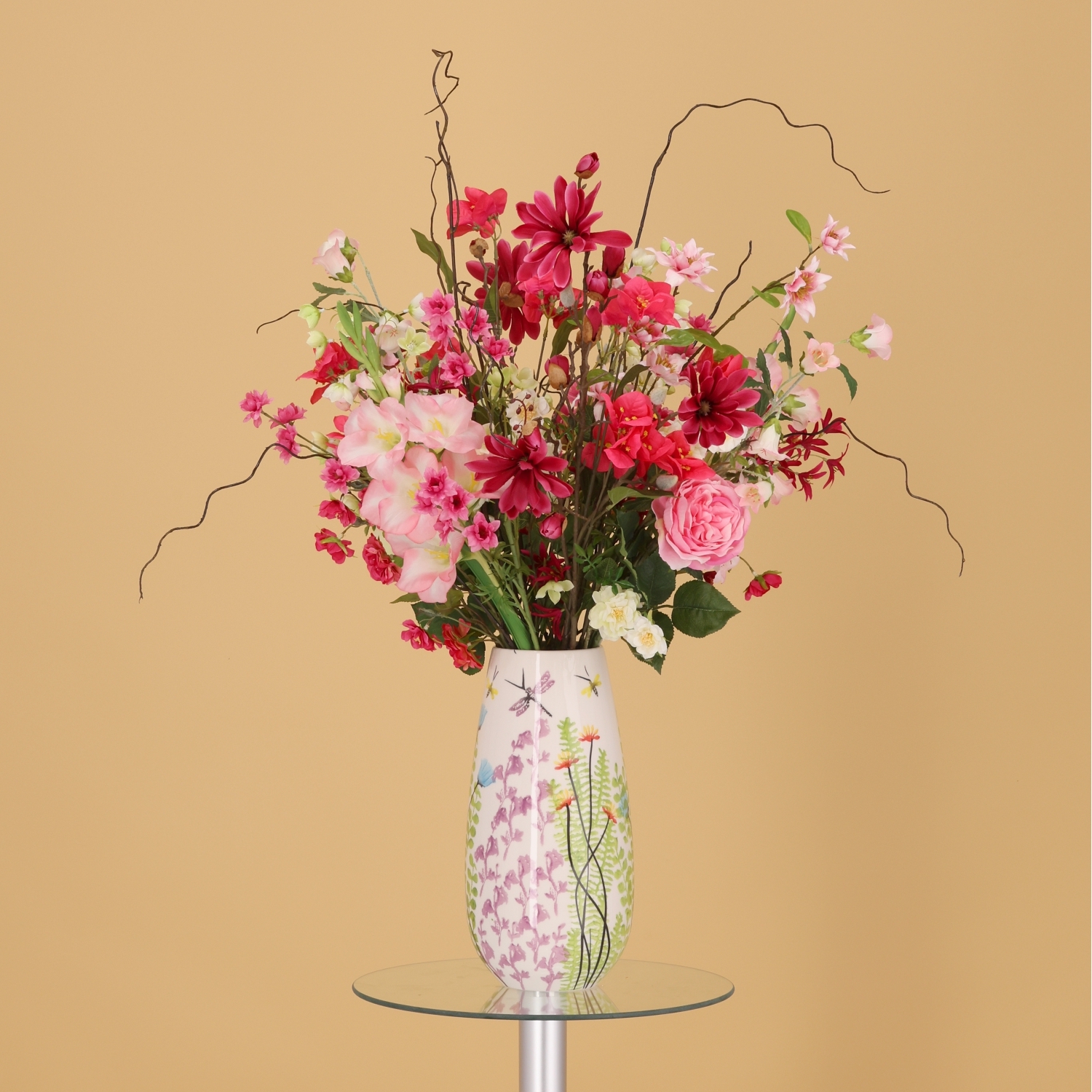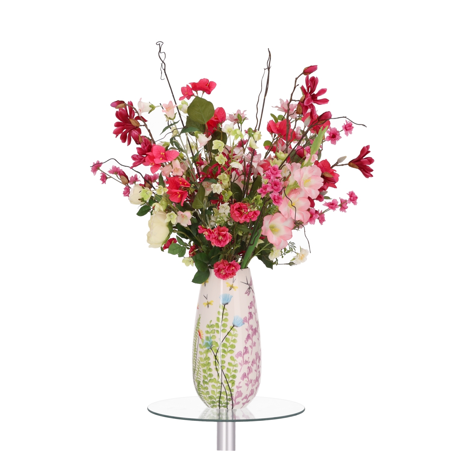 Il Mazzo di Fiori Artificiali Legato a Mano Ella Vienna di 90 cm di altezza e 65 cm di larghezza è una composizione lussuosa e vivace di fiori artificiali in delicate tonalità rosa, arricchite da tocchi di rosso, bianco e verde. Questo generoso mazzo artificiale, realizzato con cura da fioristi esperti, dona immediatamente eleganza e freschezza a qualsiasi ambiente. Grazie ai suoi colori intensi e al design arioso, diventa un vero punto focale su un tavolo da pranzo, una credenza o come elemento decorativo in una hall o in un ufficio. Nota: il vaso Madeira 17x35 cm raffigurato non è incluso.