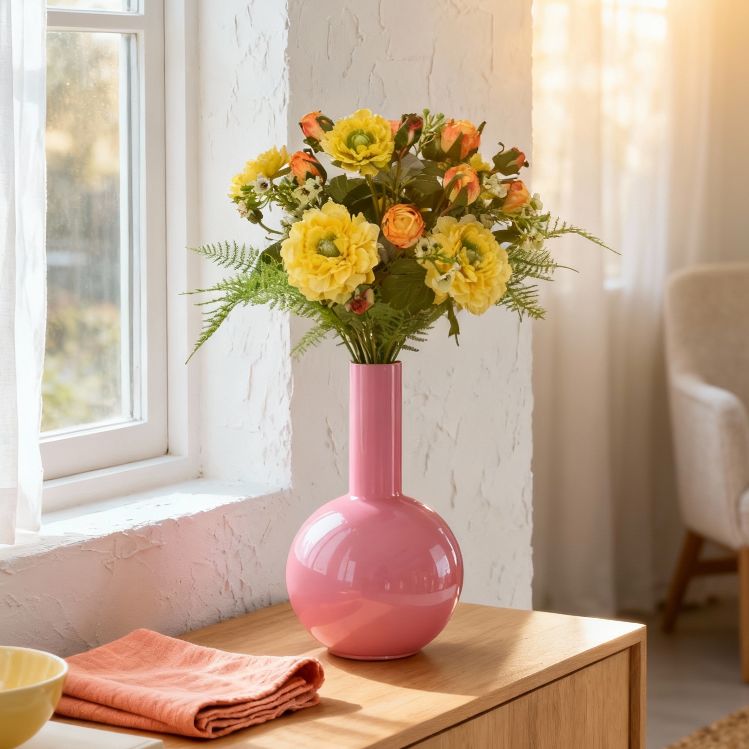 Questo mazzo di fiori artificiali legato a mano è stato realizzato con cura dai nostri fioristi esperti utilizzando materiali di alta qualità, risultando quasi indistinguibile da fiori veri. Non appassisce mai, resta in fiore tutto l’anno ed è completamente senza manutenzione. Potrete godere per anni di una fioritura elegante senza preoccuparvi di annaffiature o perdita di colore. Il mazzo viene fornito senza il vaso (Vaso Glow Medium – verde muschio), lasciandovi la libertà di scegliere il contenitore più adatto al vostro stile.