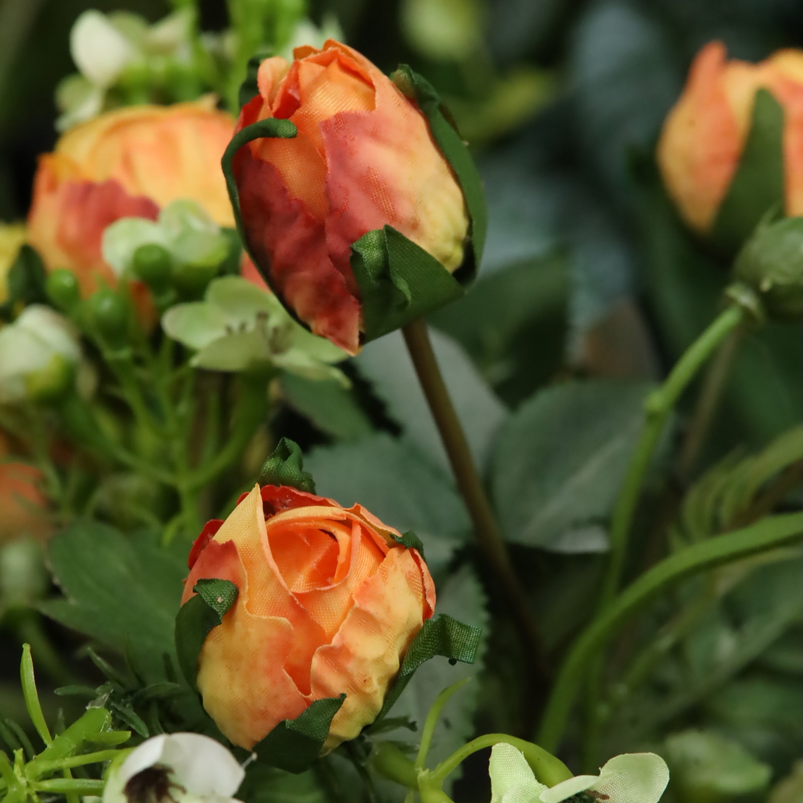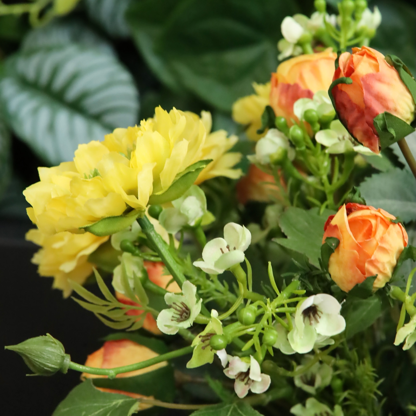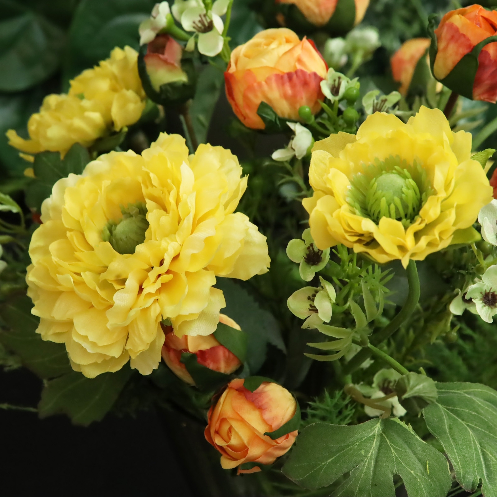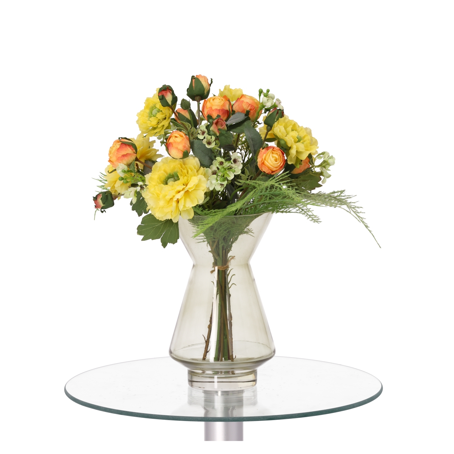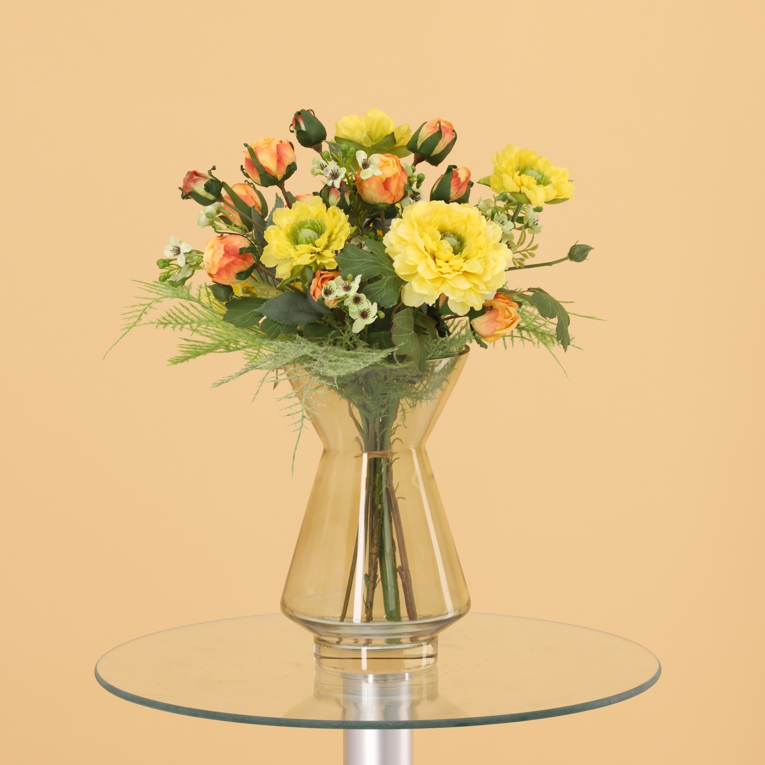 Il Mazzo di Fiori Artificiali Legato a Mano Frieda Bern 35cm Giallo è una composizione floreale raffinata e di lusso che dona calore ed eleganza a qualsiasi ambiente. Con le sue dimensioni compatte di 35 cm di altezza e larghezza, questo mazzo artificiale è perfetto per il tavolo da pranzo, una credenza, un tavolino o il bancone reception di una hall o di un ristorante. La vivace combinazione di fiori come waxflower, ranuncolo e rose artificiali crea un effetto naturale e fresco, adatto sia ad ambienti moderni che classici. Le tonalità gialle luminose si sposano armoniosamente con accenti arancioni e fogliame verde, per un tocco decorativo senza tempo.