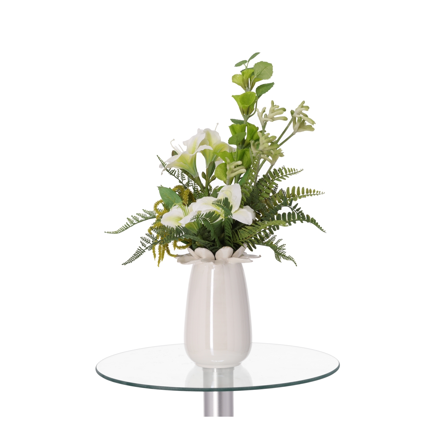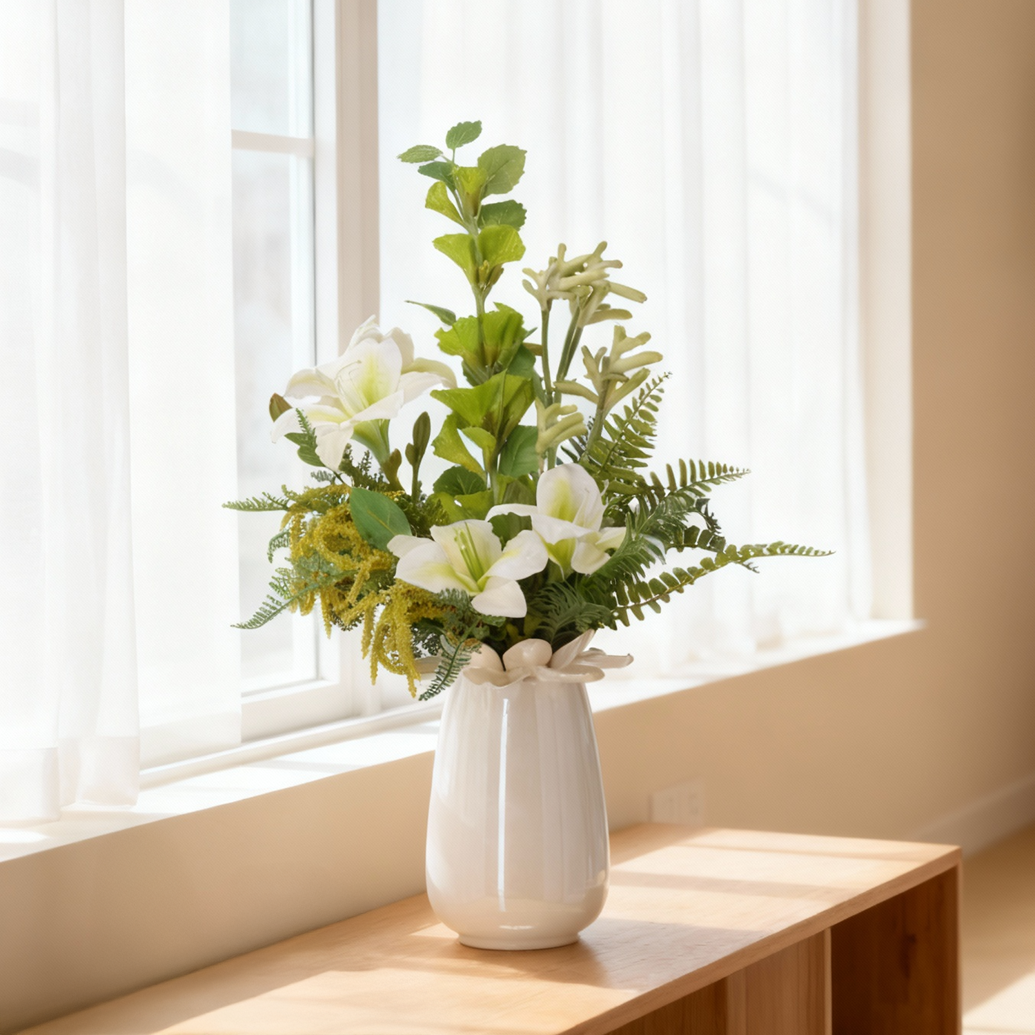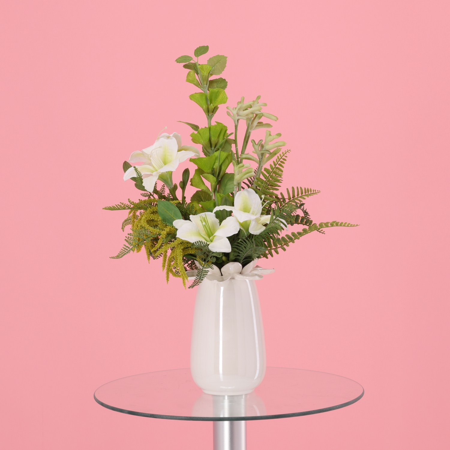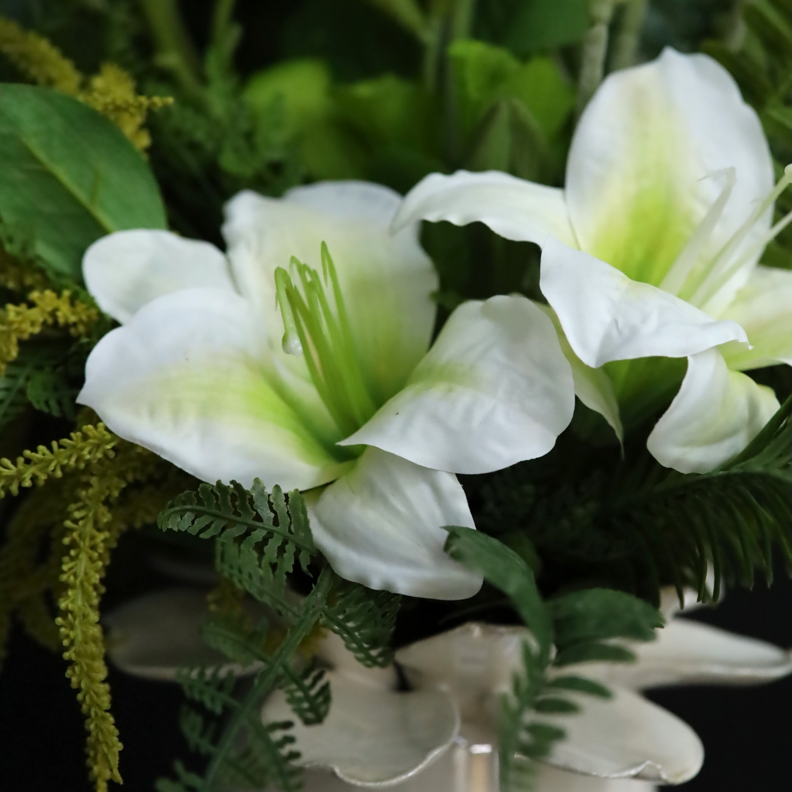 Il Mazzo di Fiori Artificiali Legato a Mano Vivienne Madrid Bianco 45 cm è un’aggiunta elegante e raffinata a qualsiasi ambiente. Con un’altezza di 45 cm e una larghezza di 30 cm, questo bouquet compatto è perfetto per il tavolo da pranzo, la credenza, un tavolino o come elemento decorativo in una hall o in un ristorante. La combinazione di amarilli, zampe di canguro e felci dona al bouquet un aspetto fresco e naturale. Le tonalità bianche trasmettono calma ed eleganza, mentre il fogliame verde aggiunge un contrasto vivace che si adatta perfettamente sia agli interni moderni che classici.