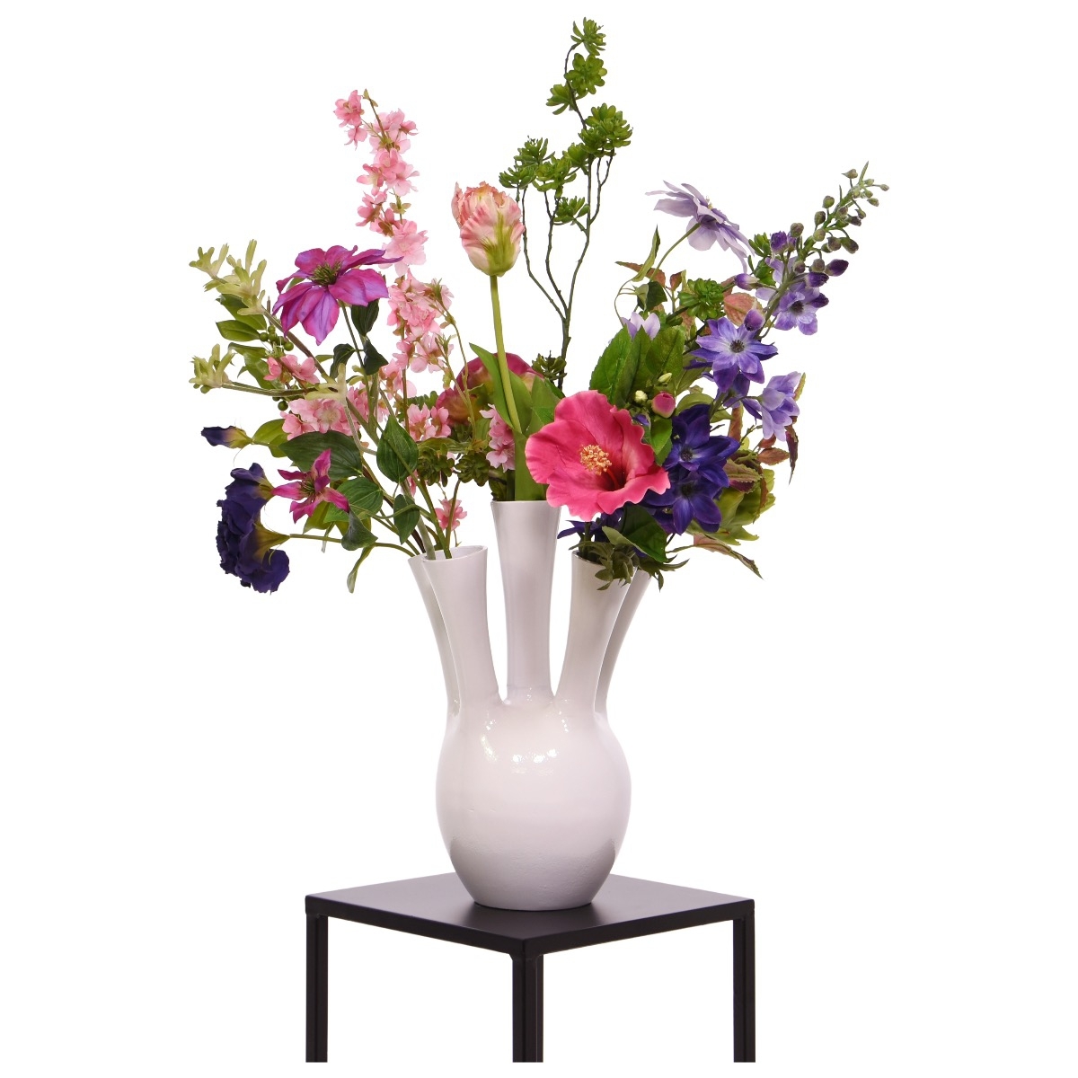 Il bouquet d'arte Aurora Nice è un meraviglioso bouquet con tonalità di rosa e viola. La combinazione di fiori delicati dona un aspetto allegro con un accento giocoso. L'altezza totale è di 85 centimetri e la larghezza è di 70 centimetri. L'altezza dalla parte superiore del vaso alla parte superiore del bouquet è di 50 centimetri.