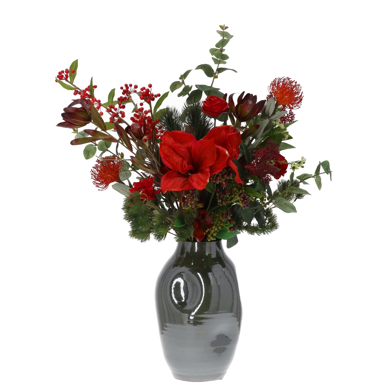 Il Mazzo di Fiori Artificiali Legato a Mano Mireille Grenoble 80 cm è un bouquet elegante e raffinato che dona calore e stile grazie alle sue intense tonalità di rosso. La composizione combina garofani rossi, una splendida protea voluminosa, una delicata rosa