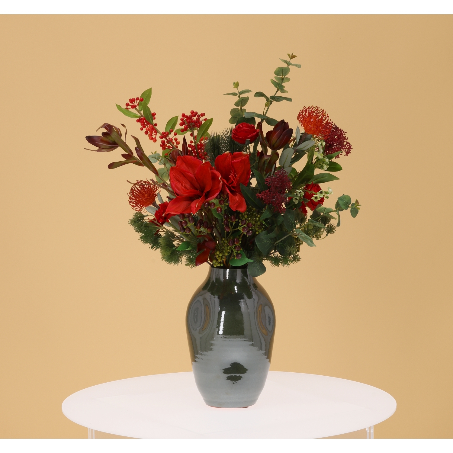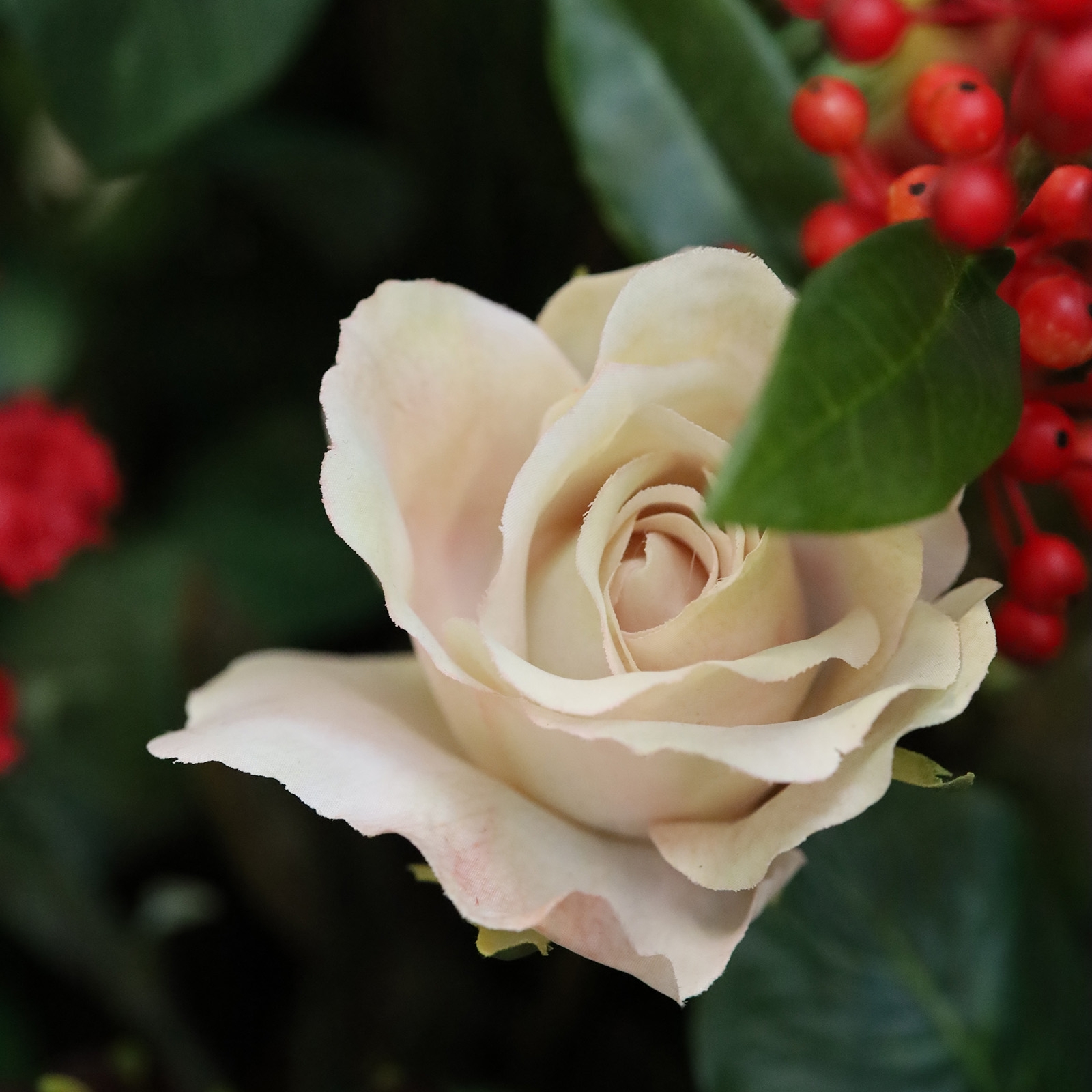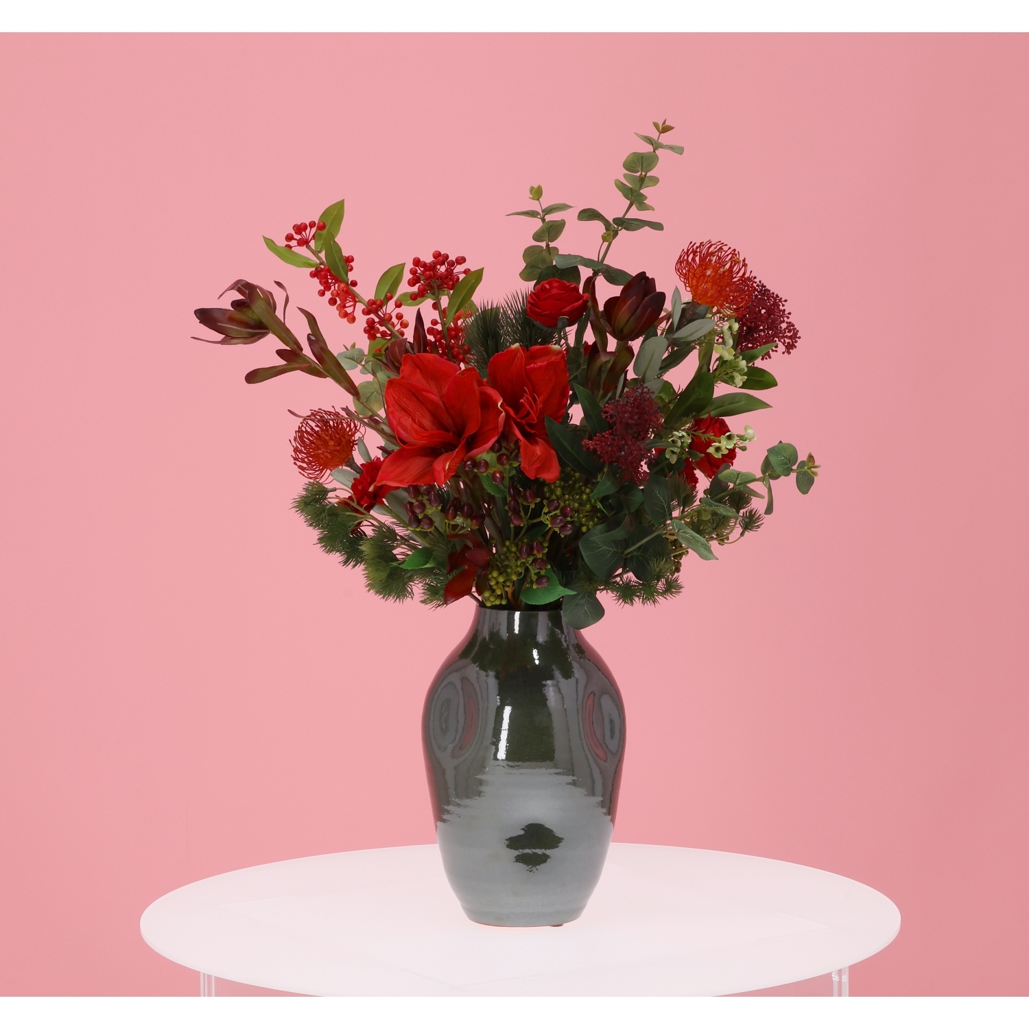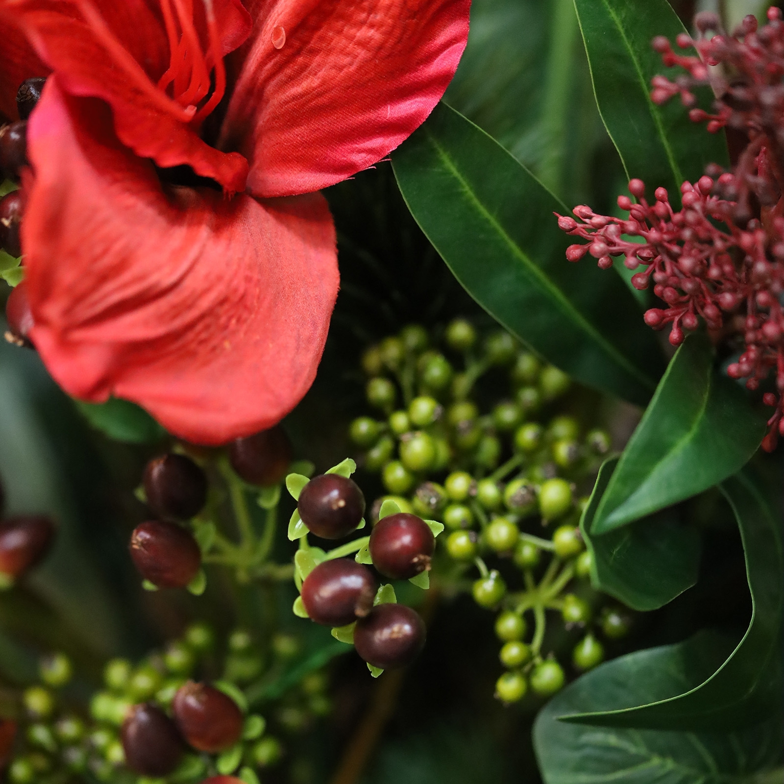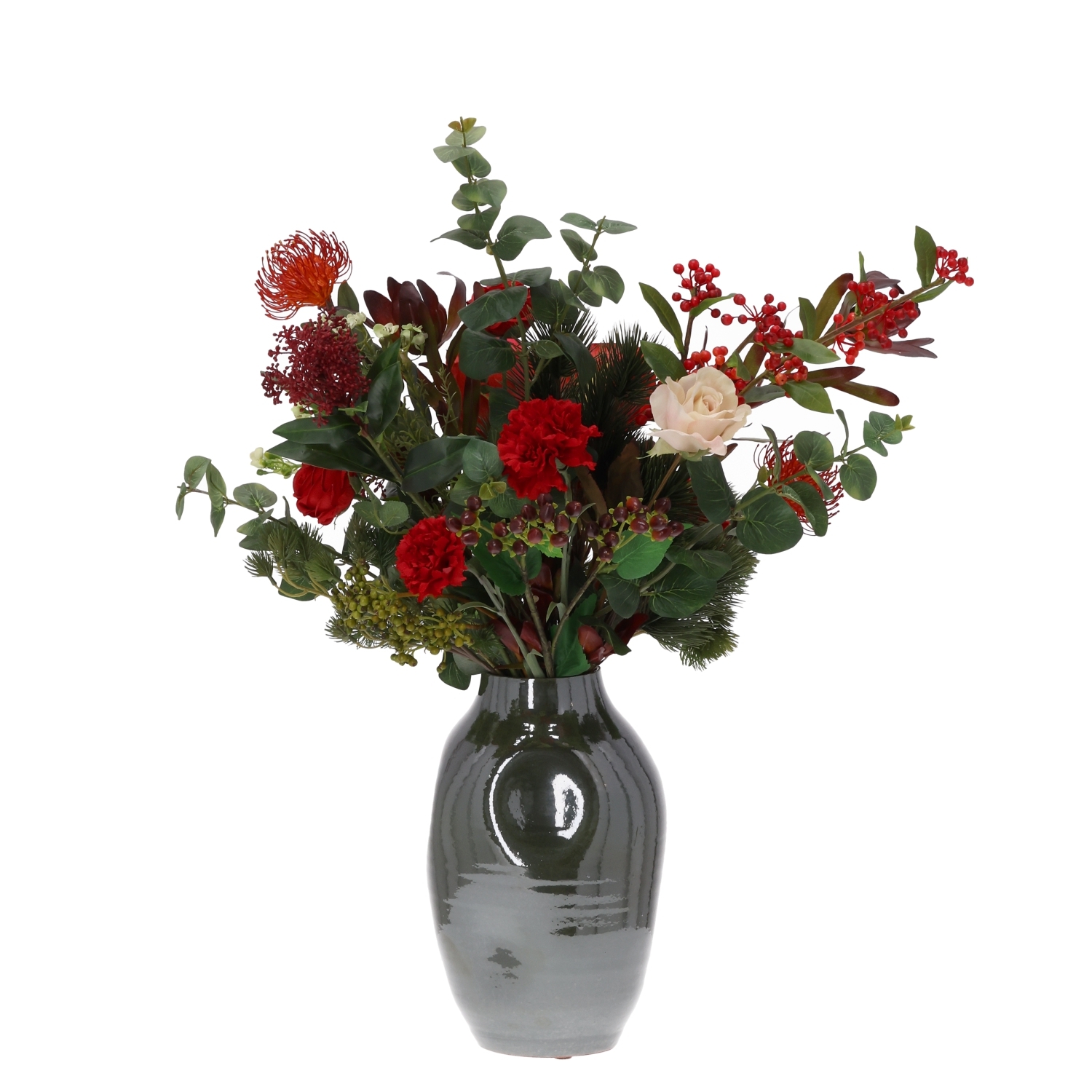 Il Mazzo di Fiori Artificiali Legato a Mano Mireille Grenoble 80 cm è un bouquet elegante e raffinato che dona calore e stile grazie alle sue intense tonalità di rosso. La composizione combina garofani rossi, una splendida protea voluminosa, una delicata rosa color champagne, eucalipto e sottili rami con bacche, creando un look naturale e moderno ideale per tavoli da pranzo, banconi e hall d’ingresso. Nota: il mazzo è fornito senza il vaso mostrato.