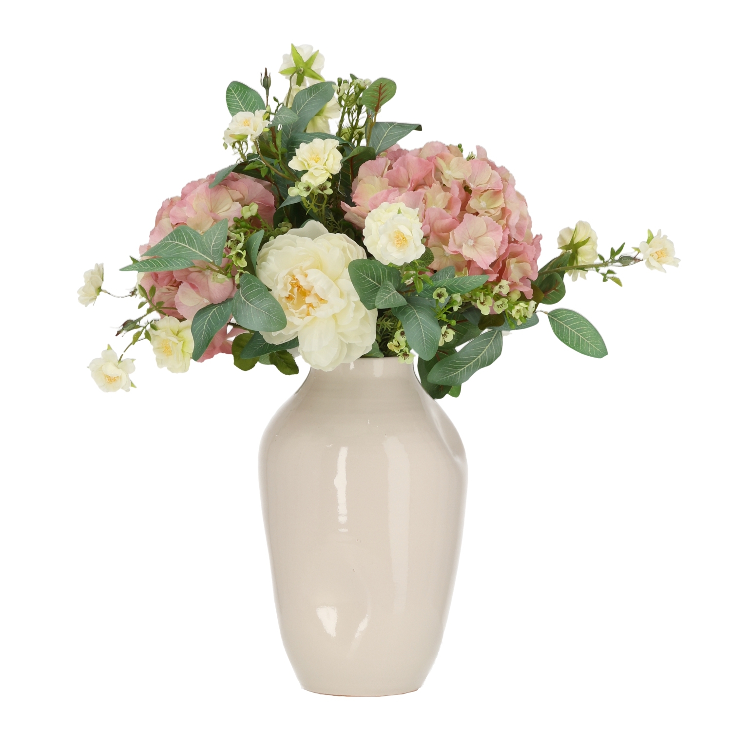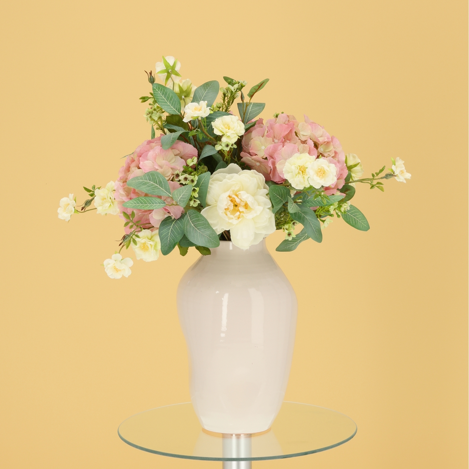 Il bouquet artigianale Rose York - Rosa è una composizione raffinata ed elegante di fiori artificiali, con un'altezza generosa di 65 cm e una larghezza di 55 cm, perfetto per ogni spazio. Questo bouquet combina delicati toni di rosa e bianco con rami di eucalipto per un effetto rilassante. I fiori di questo bouquet sono stati accuratamente selezionati per creare un'atmosfera realistica e lussuosa. L'ortensia rosa artificiale, il ramo di cera artificiale e il ramo di eucalipto artificiale insieme creano un effetto completo e affascinante. L'aggiunta della peonia artificiale in crema e della rosa selvatica artificiale in crema rende questo bouquet armonioso e perfetto come regalo.
