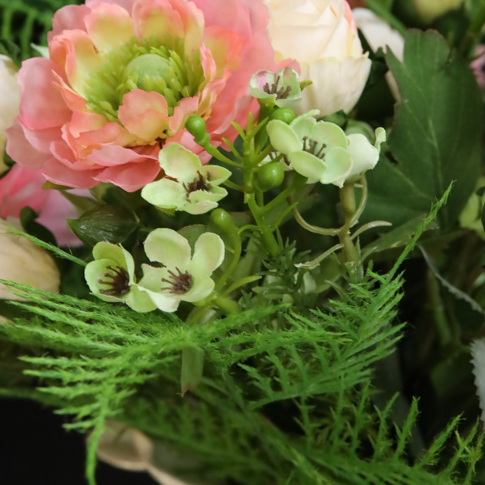 Il Mazzo di Fiori Artificiali Legato a Mano Frieda Bern, alto 35 cm e largo 30 cm, è una composizione affascinante e lussuosa di fiori artificiali in delicate tonalità rosa. Questo mazzo artificiale emana raffinatezza ed eleganza, accuratamente realizzato da e