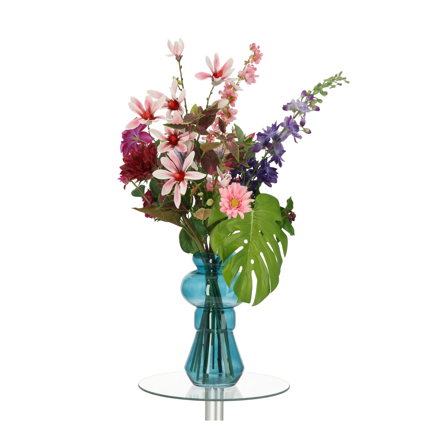 Heather Glasgow è un allegro bouquet floreale artificiale con sfumature di rosa e viola. La combinazione di fiori conferisce un aspetto giocoso con un accento gioioso. L'altezza totale è di 90 centimetri e la larghezza è di 60 centimetri. L'altezza dalla parte superiore del vaso alla parte superiore del bouquet è di 60 centimetri.