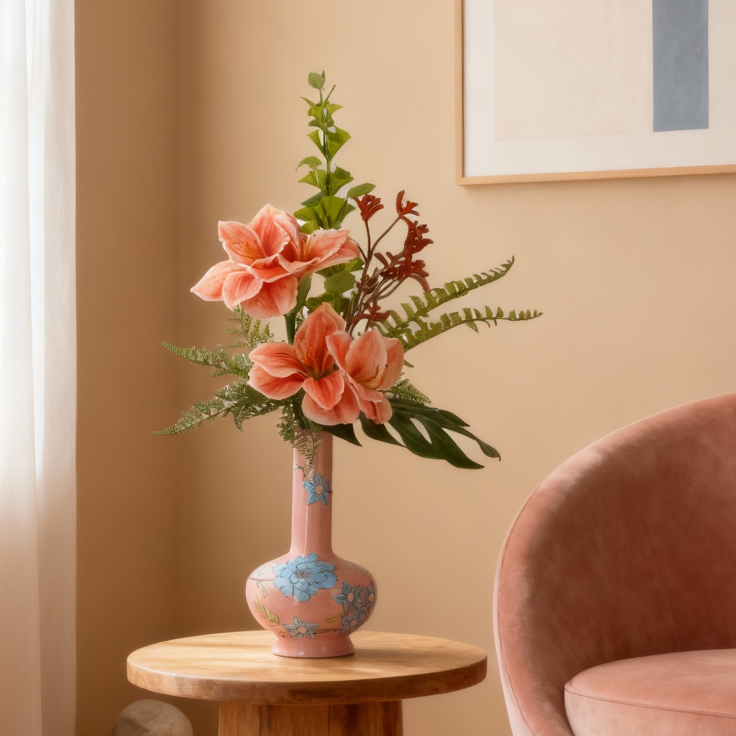 Aggiungi un tocco di bellezza duratura al tuo interno con il lussuoso bouquet artificiale Mia Oslo di BM™ Luxury! Questo bellissimo bouquet è una composizione artistica dei più bei fiori artificiali, selezionati con cura dai nostri fioristi esperti. Questo bouquet raffinato, con tonalità delicate di rosa salmone e verde, è una composizione artistica che arricchisce lo spazio in modo raffinato e sereno. Il bouquet contiene, tra gli altri, raffinati Amaryllis, delicate Kangaroo Paw e tocchi di verde grazie alla Molucella e ai rami di Ledervaren. Ogni ramo è stato accuratamente selezionato e combinato con maestria per creare un'impressione armoniosa e morbida. Questo bouquet è perfetto per ogni ambiente e offre una soluzione senza manutenzione per un'eleganza duratura.