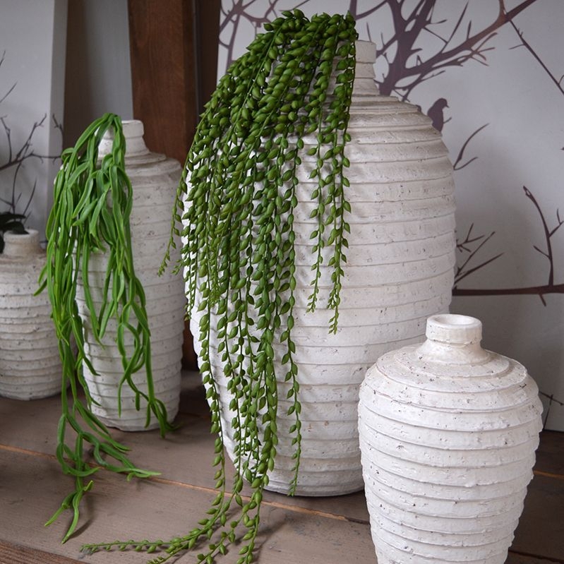 Questa pianta artificiale ricadente Senecio Pearl, chiamata anche "filo di perle" o pianta di piselli, è una varietà succulenta e una bellissima pianta artificiale decorativa. Questa varietà presenta piccole sfere ovali che pendono in bellissimi fili. La piant