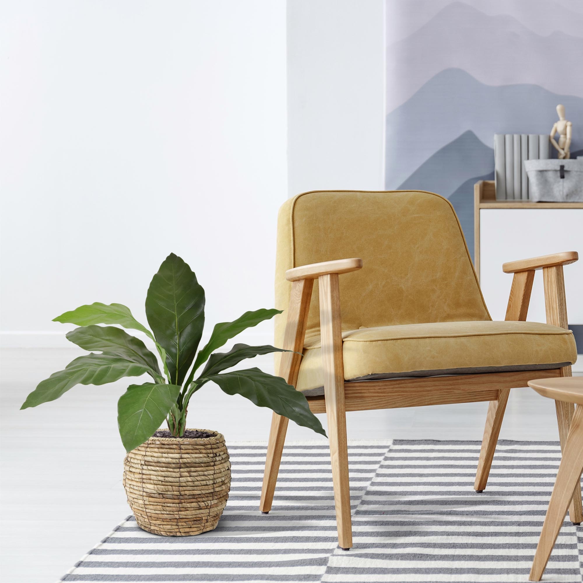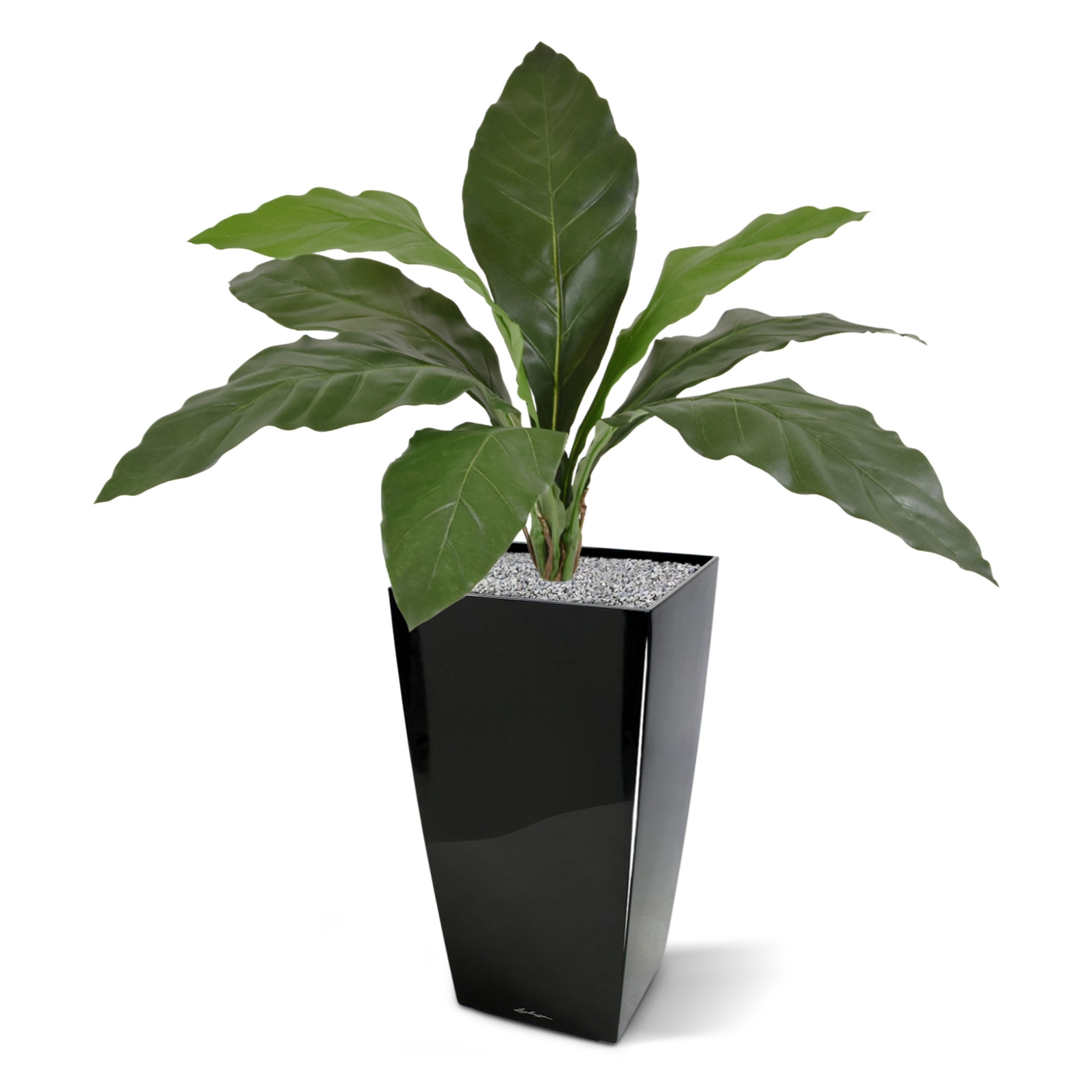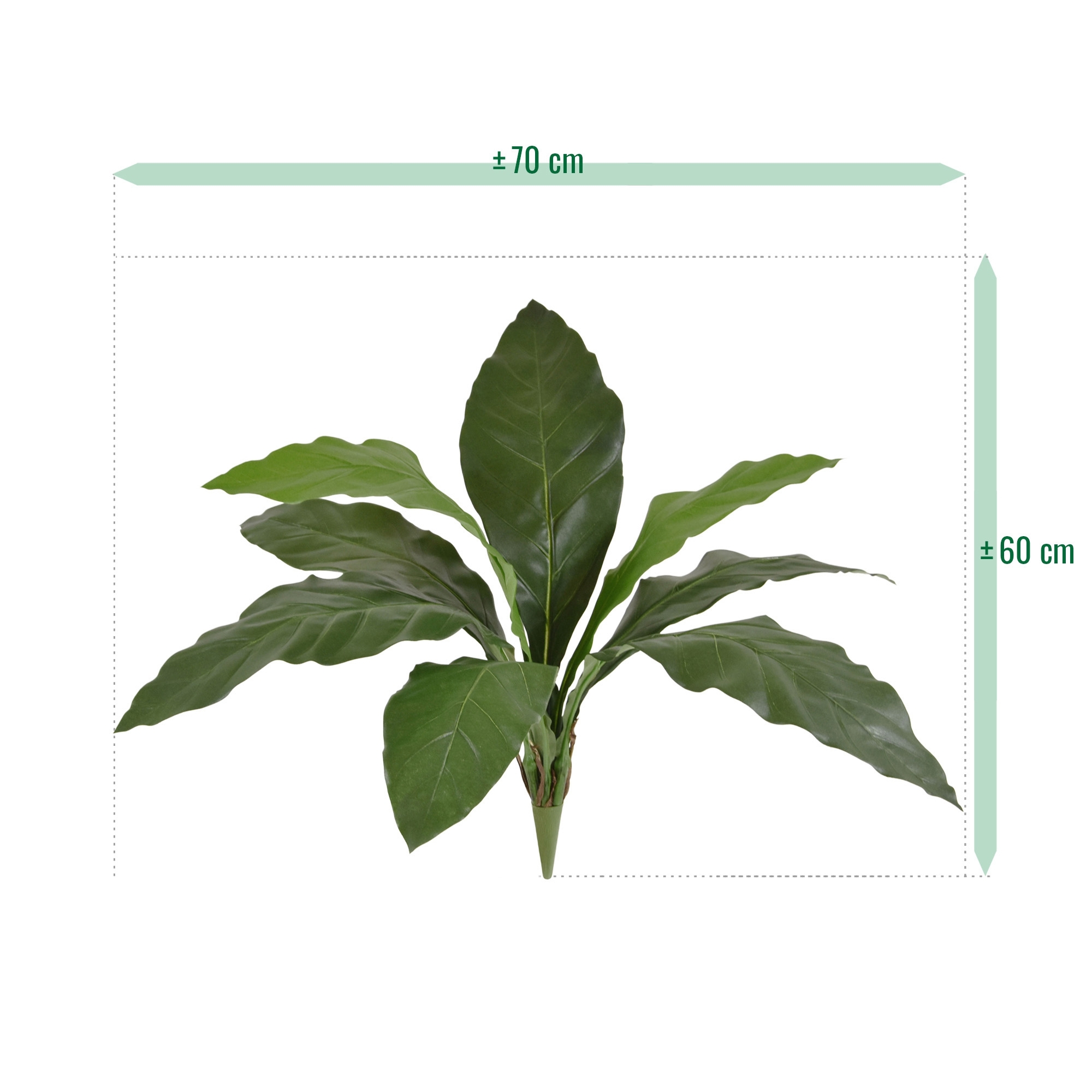 Le grandi foglie artificiali di Anthurium in seta creano un diametro di circa 70 cm e un'altezza di circa 60 cm. Grazie al suo aspetto imponente, il Jungle King è particolarmente adatto per essere collocato in un bel vaso alto.