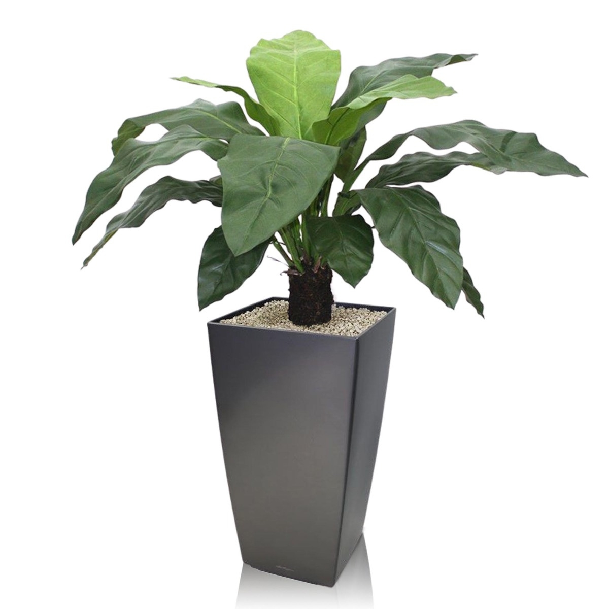 Questa pianta artificiale verde particolarmente bella, chiamata Jungle King, proviene dall'ampia famiglia delle piante di Anthurium. Le belle foglie verde scuro sono imitate molto bene e hanno lo stesso aspetto esclusivo dell'esemplare reale. Le grandi foglie