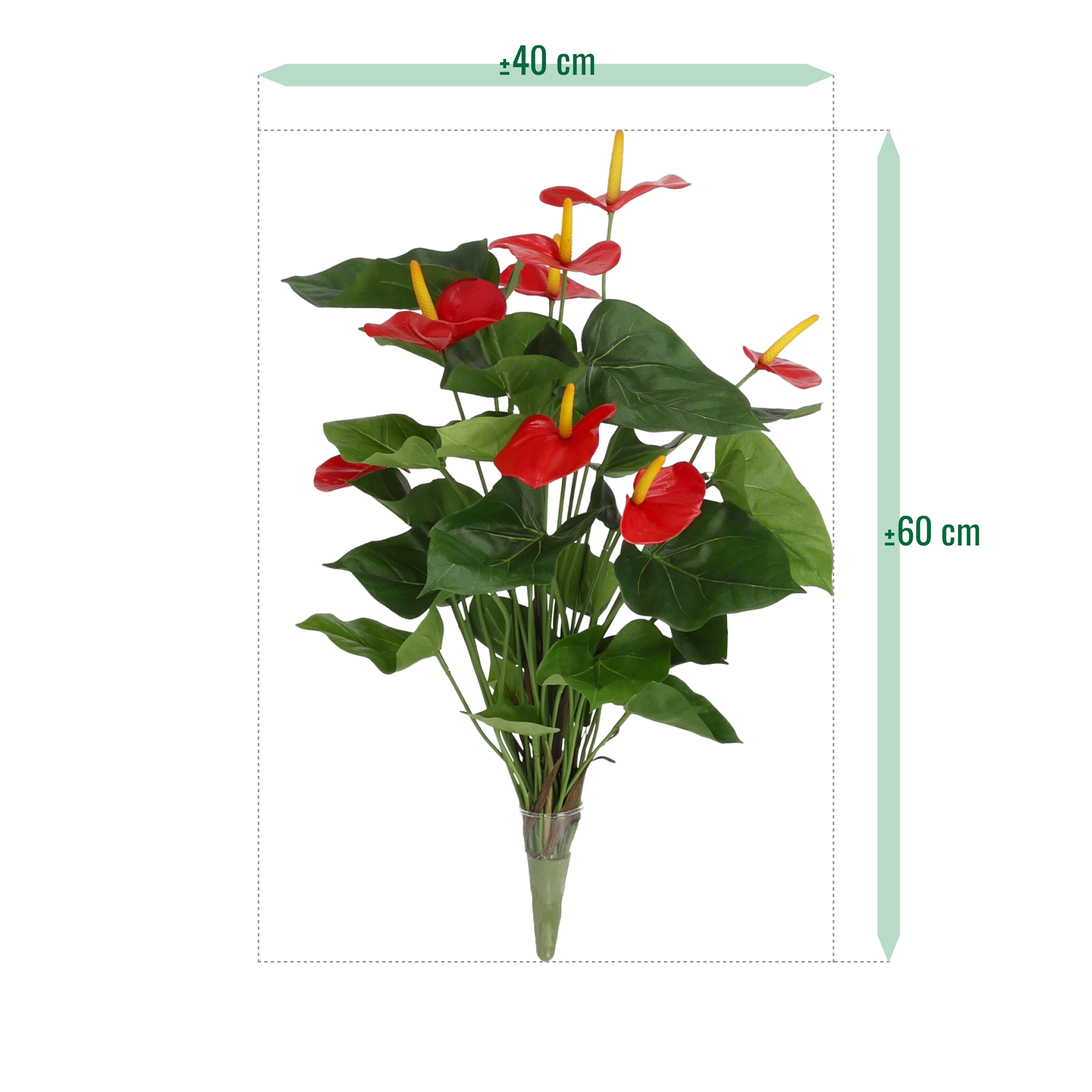 In questa versione, l'Anthurium di seta viene consegnato come una stecca separata, così da poterlo facilmente collocare in un arrangiamento o vaso. L'Anthurium ha un aspetto ricco grazie alla combinazione dei bellissimi fiori e delle foglie ed è un'aggiunta spettacolare a qualsiasi stanza.