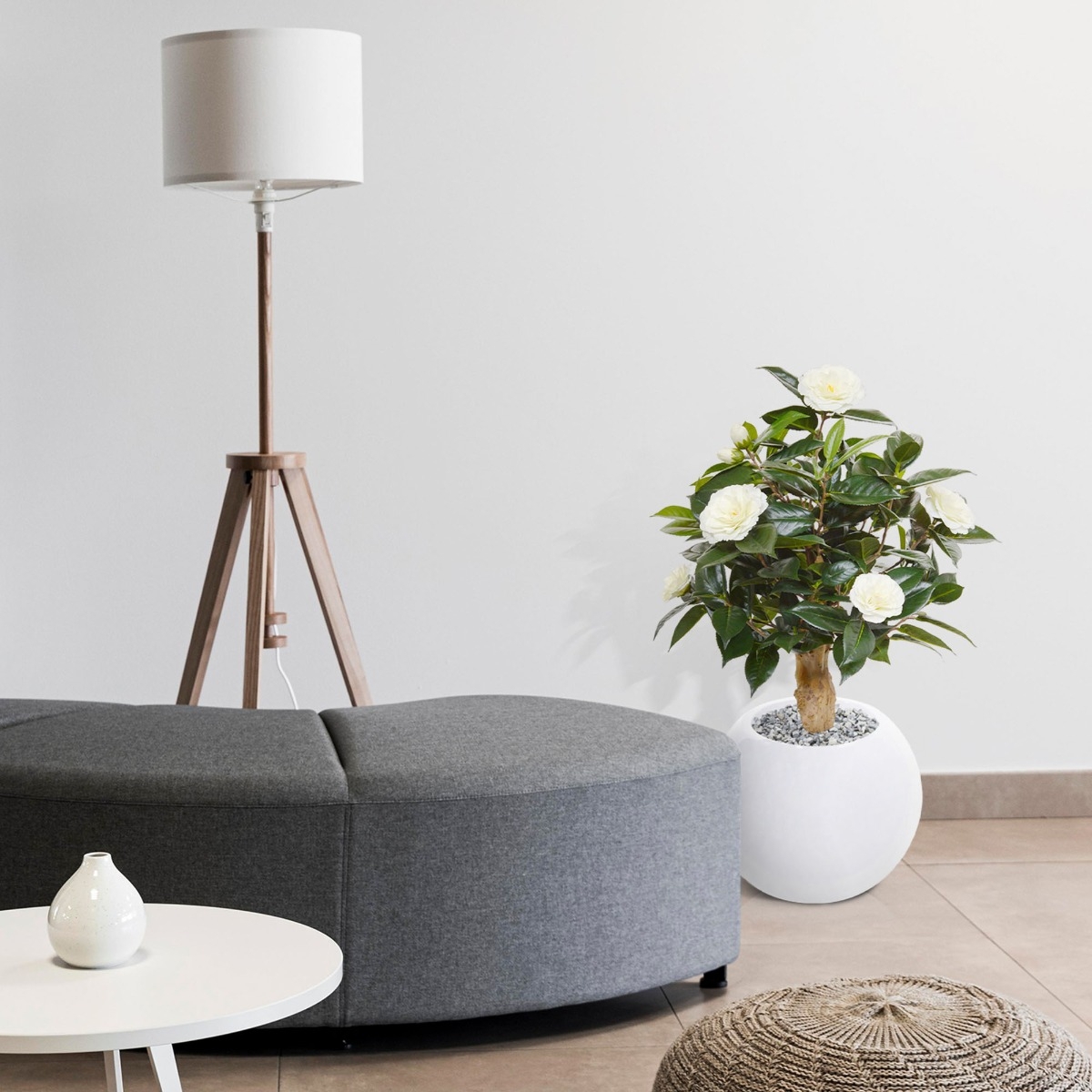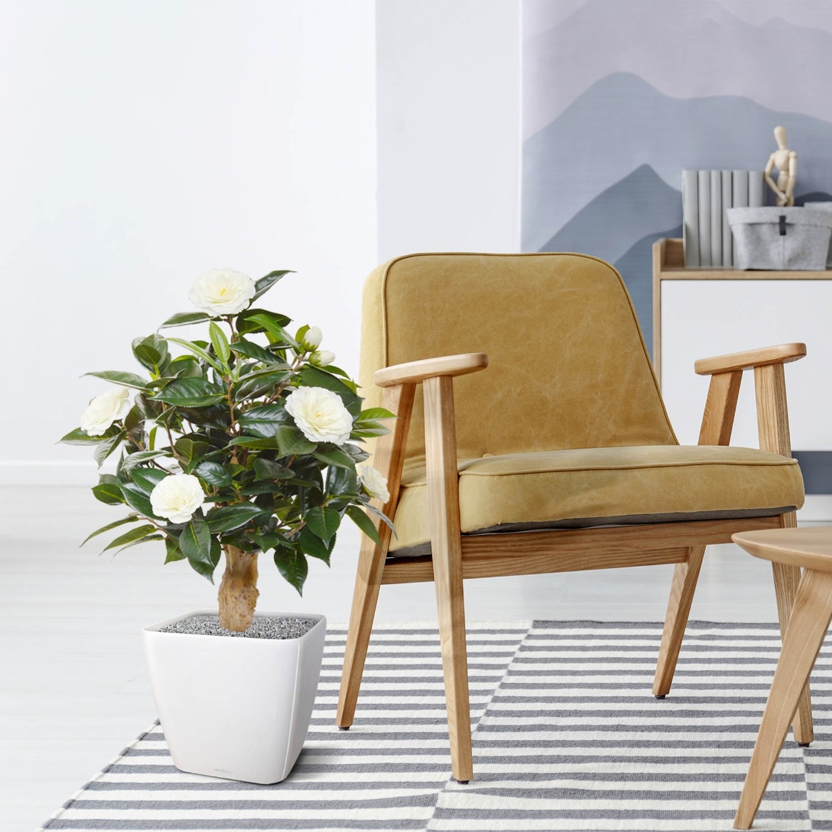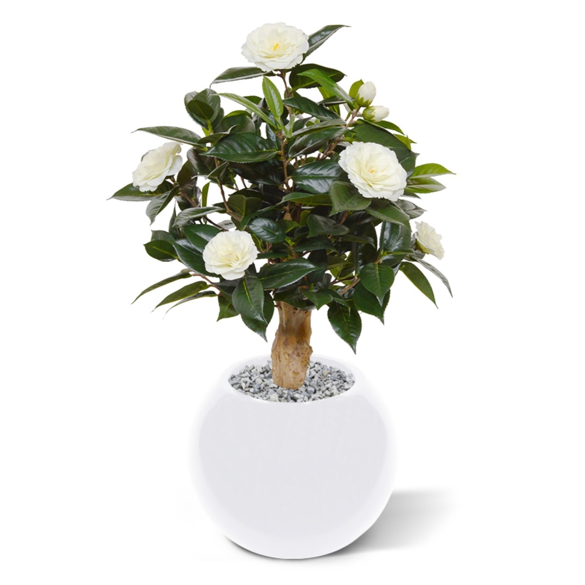 Lasciatevi sorprendere da questa pianta artificiale Camelia a piedi e innamoratevi dei seducenti fiori doppi in un bellissimo color crema. Questa Camelia ricreata ad arte su un vero tronco di legno, di cui la Rosa Giapponese è la specie più famosa, è l'artefic