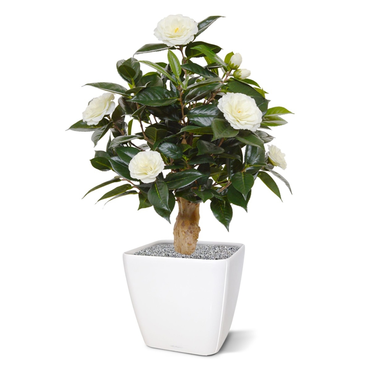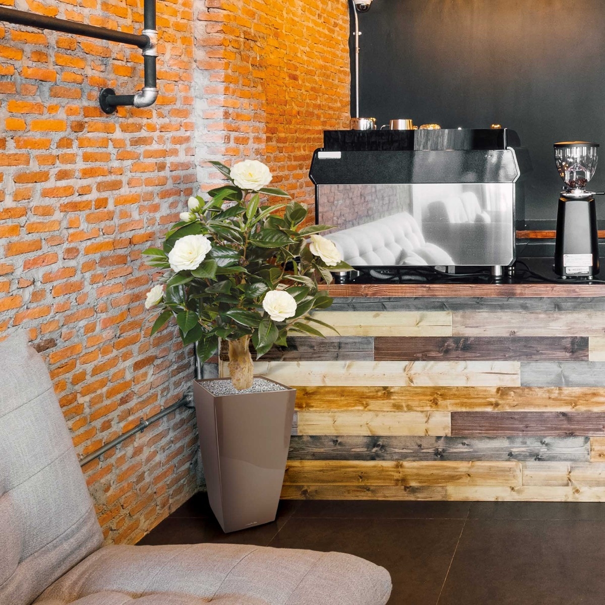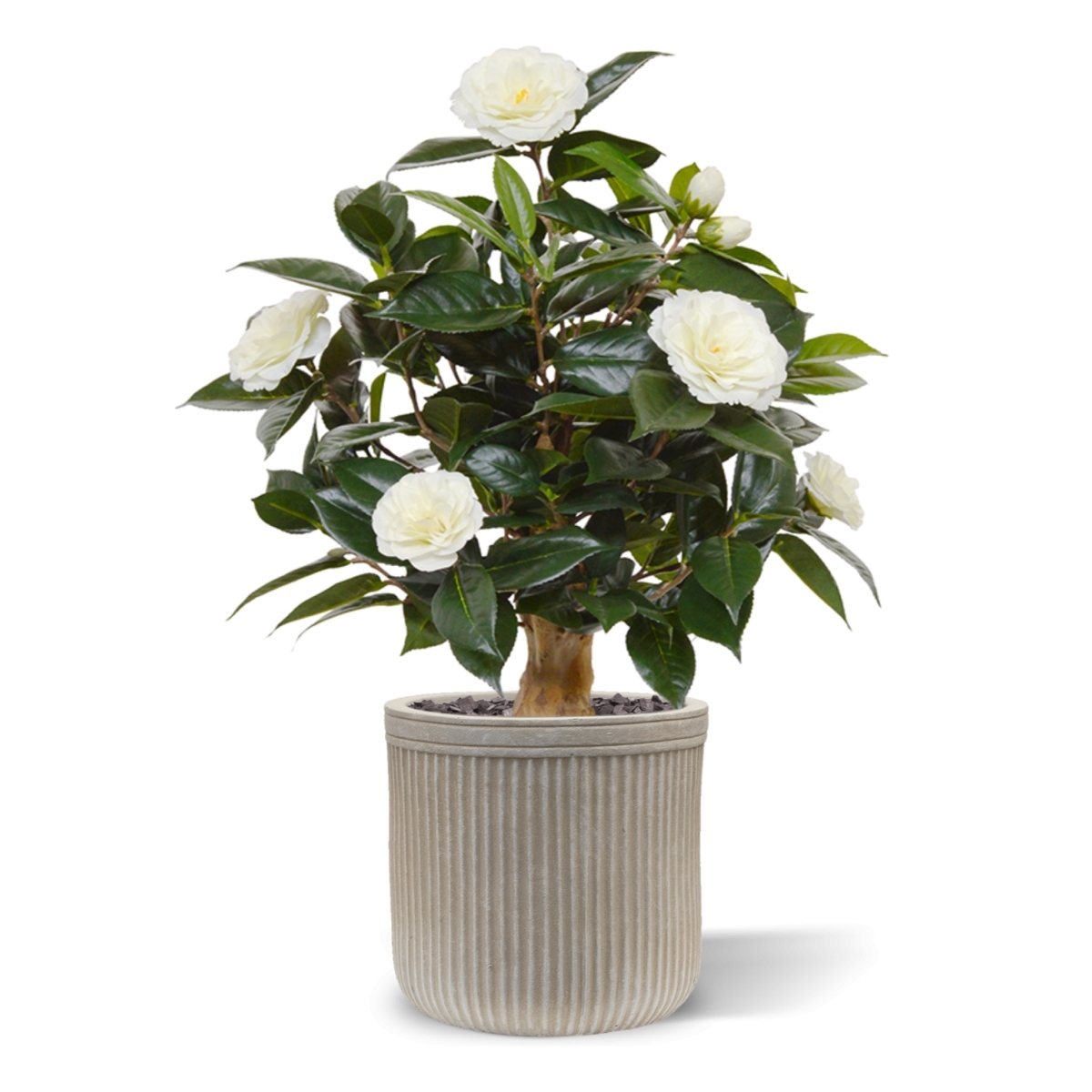 Lasciatevi sorprendere da questa pianta artificiale Camelia a piedi e innamoratevi dei seducenti fiori doppi in un bellissimo color crema. Questa Camelia ricreata ad arte su un vero tronco di legno, di cui la Rosa Giapponese è la specie più famosa, è l'artefic