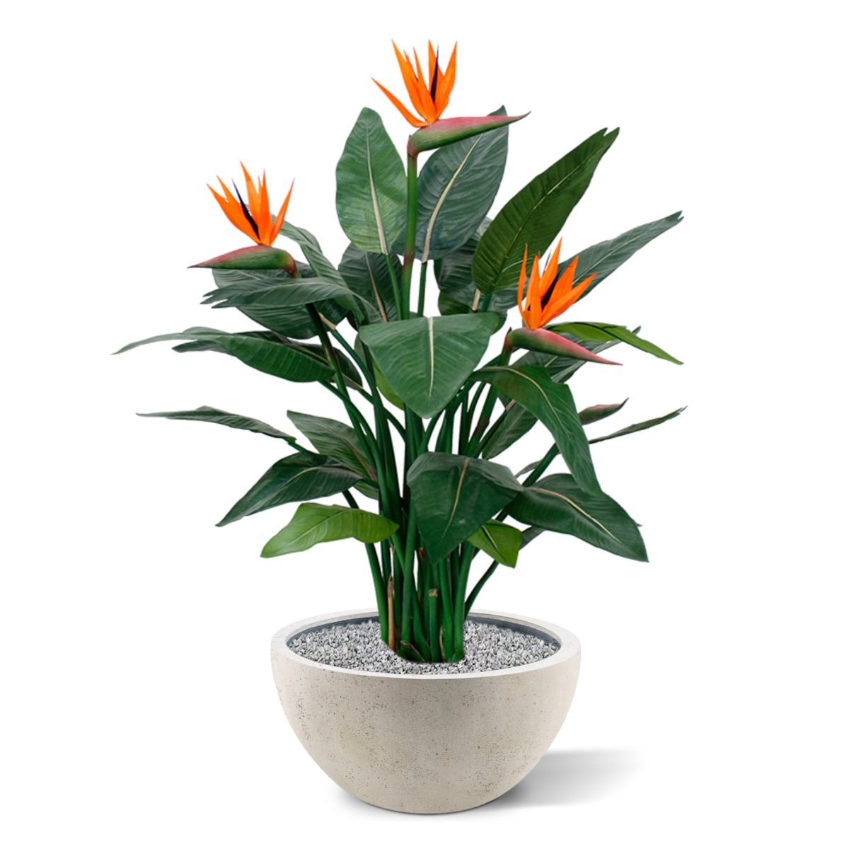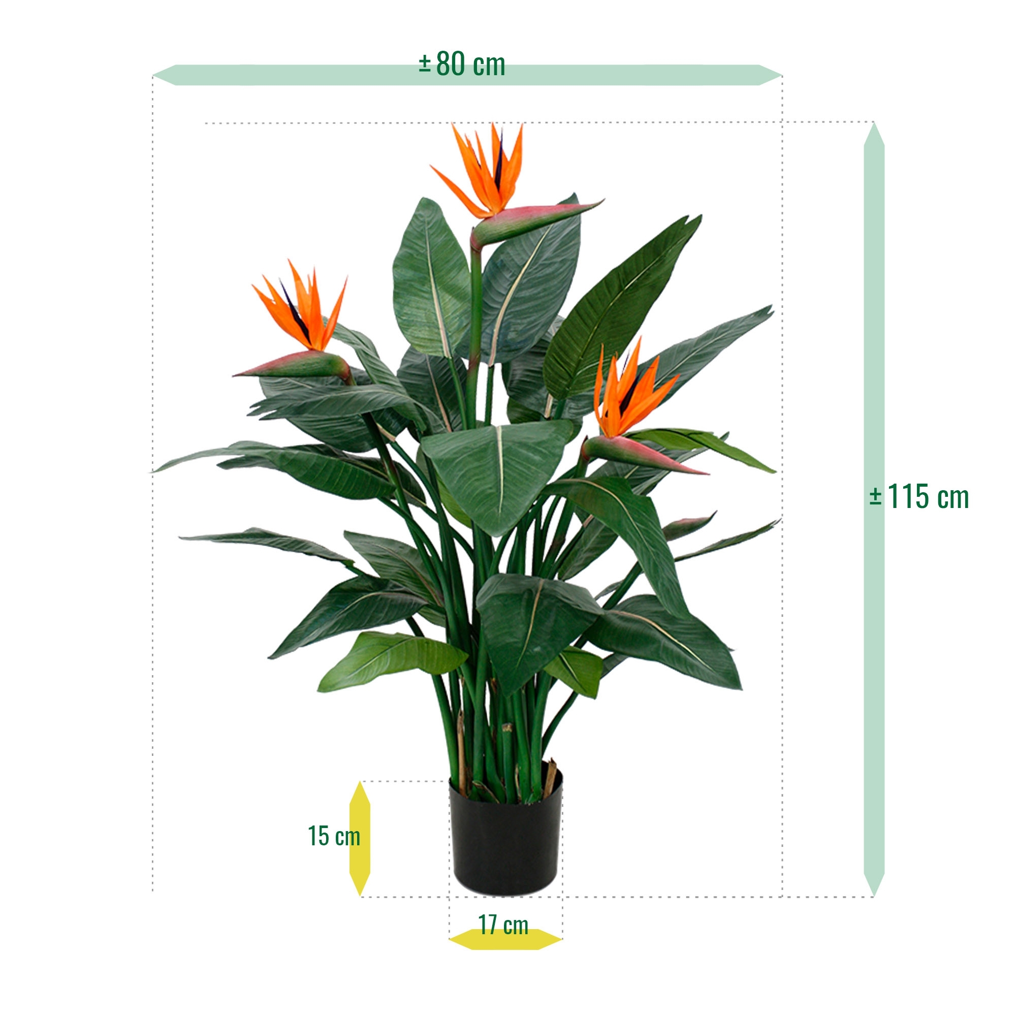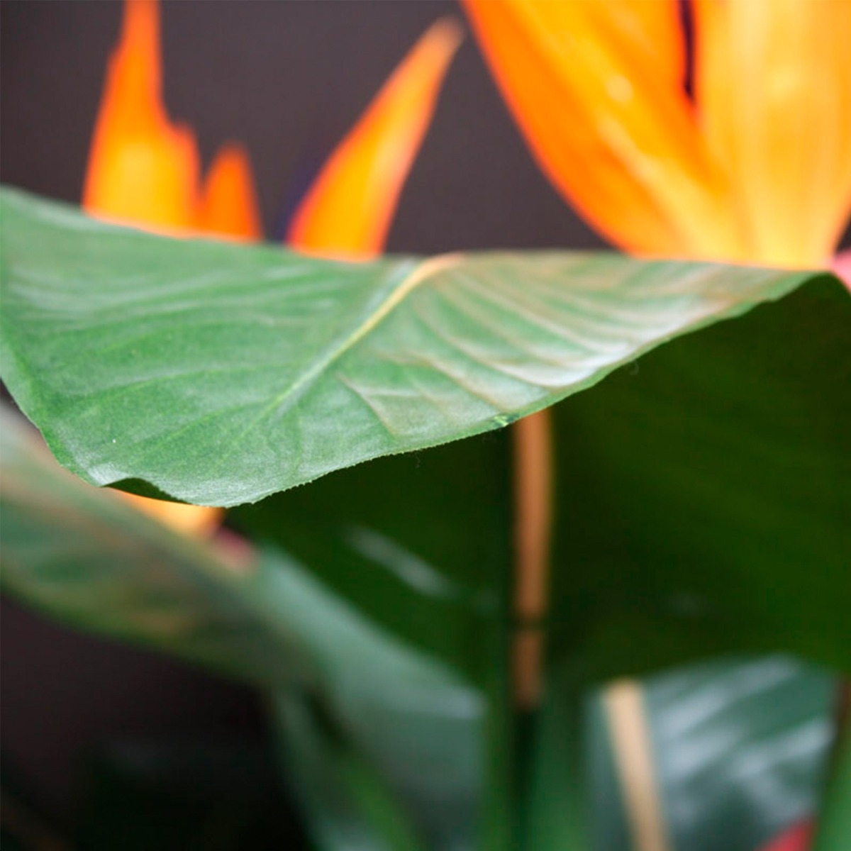 Scopri lo splendore esotico della pianta di seta artificiale Strelitzia Deluxe 115 cm, nota anche come Uccello del Paradiso. Ammirate la bellezza di questa sorpresa tropicale, ricreata con straordinaria precisione. I lussureggianti fiori color arancio sono un'ode all'artigianato e alla raffinatezza, mentre la stampa dettagliata delle foglie aggiunge una vivacità naturale.