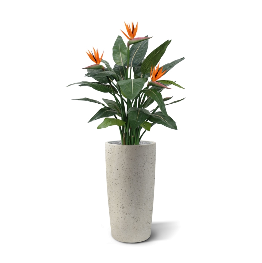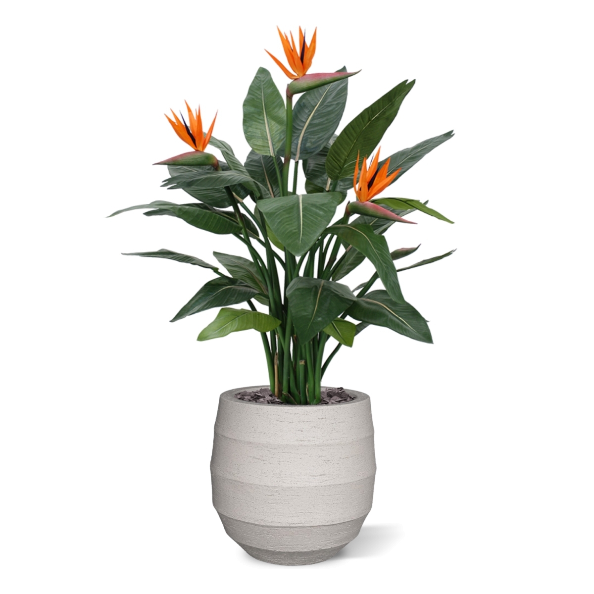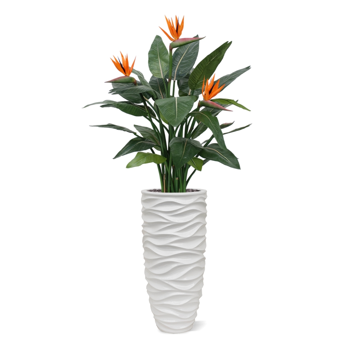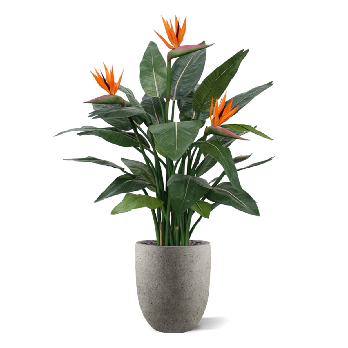 Scopri lo splendore esotico della pianta di seta artificiale Strelitzia Deluxe 115 cm, nota anche come Uccello del Paradiso. Ammirate la bellezza di questa sorpresa tropicale, ricreata con straordinaria precisione. I lussureggianti fiori color arancio sono un'ode all'artigianato e alla raffinatezza, mentre la stampa dettagliata delle foglie aggiunge una vivacità naturale.