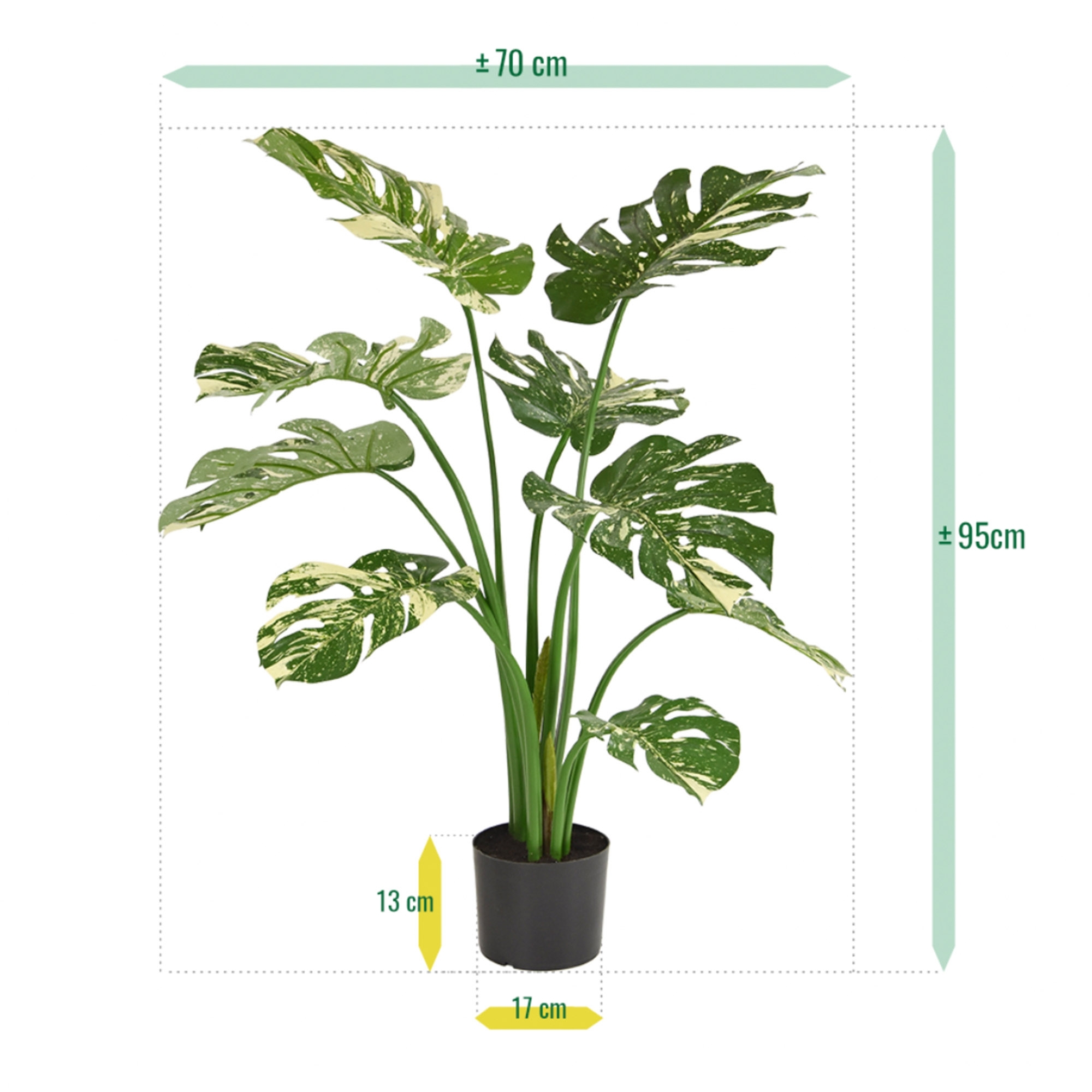 La Monstera, chi non la conosce! La popolare pianta d'appartamento, che avrete sicuramente già visto, non è amata per niente. Questa pianta artificiale, chiamata anche "pianta del buco", sarà il pezzo forte dei vostri interni. Tra l'altro, l'aspetto esotico, le dimensioni delle foglie e le varie tonalità di verde del fogliame ne fanno una pianta memorabile, facile da collocare in un angolo vuoto della vostra casa. Dagli strani buchi nelle foglie, come avviene nella varietà vivente, alla sovrabbondanza di colori, questa Monstera è estremamente realistica. La pianta artificiale di Monstera nei colori verde e pelliccia è lunga 95 cm, larga 70 cm e viene fornita di serie in un vaso interno di plastica. Il vaso misura 13 cm per 17 cm. I vasi decorativi illustrati possono essere ordinati direttamente con la pianta a un costo aggiuntivo.