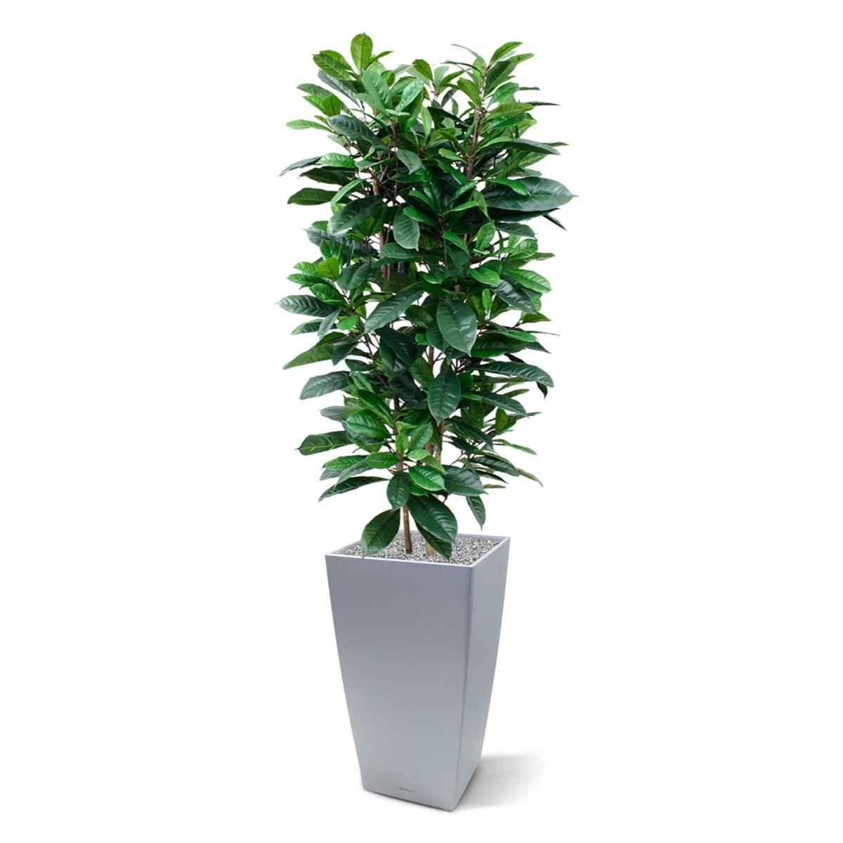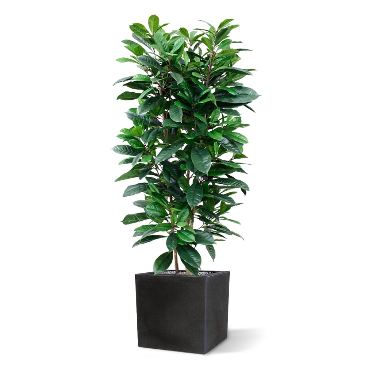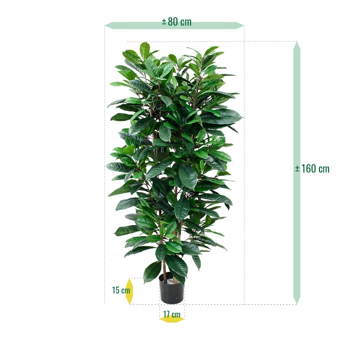 Ficus artificiale in seta ricreato in modo estremamente fedele, del tipo Cyathistipula. Grazie alla sua speciale costruzione 3D, è quasi indistinguibile dal vero! Il colore delle foglie è verde e l'altezza totale è di circa 160 cm. L'albero è molto adatto per