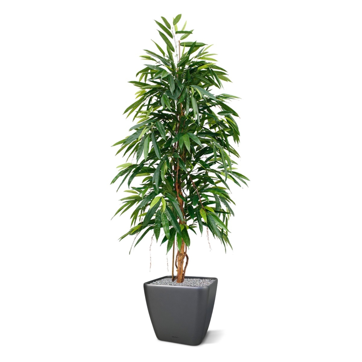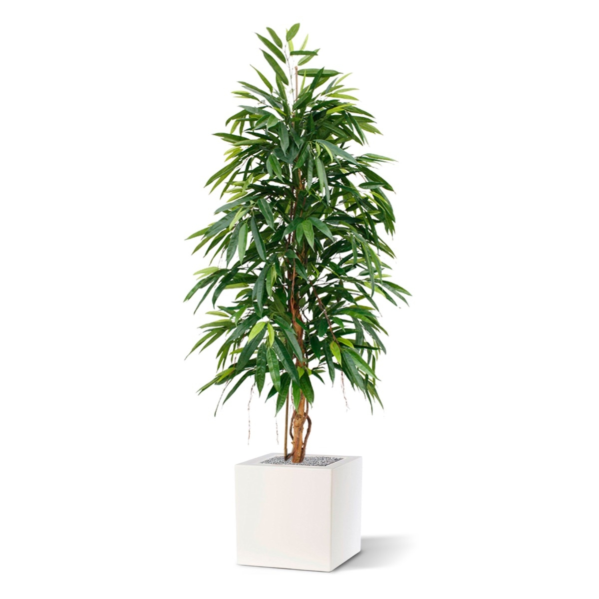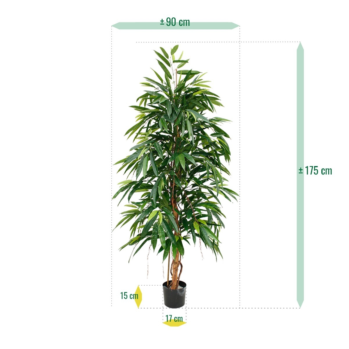 Questo nuovo albero artificiale Ficus Longifolia Royal da 175 cm, con le sue lunghe foglie appuntite, si distingue nella famiglia dei Ficus. Grazie al suo vero tronco in legno, avvolto da una vite e con radici aeree simulate, l'albero ha un aspetto molto fedel