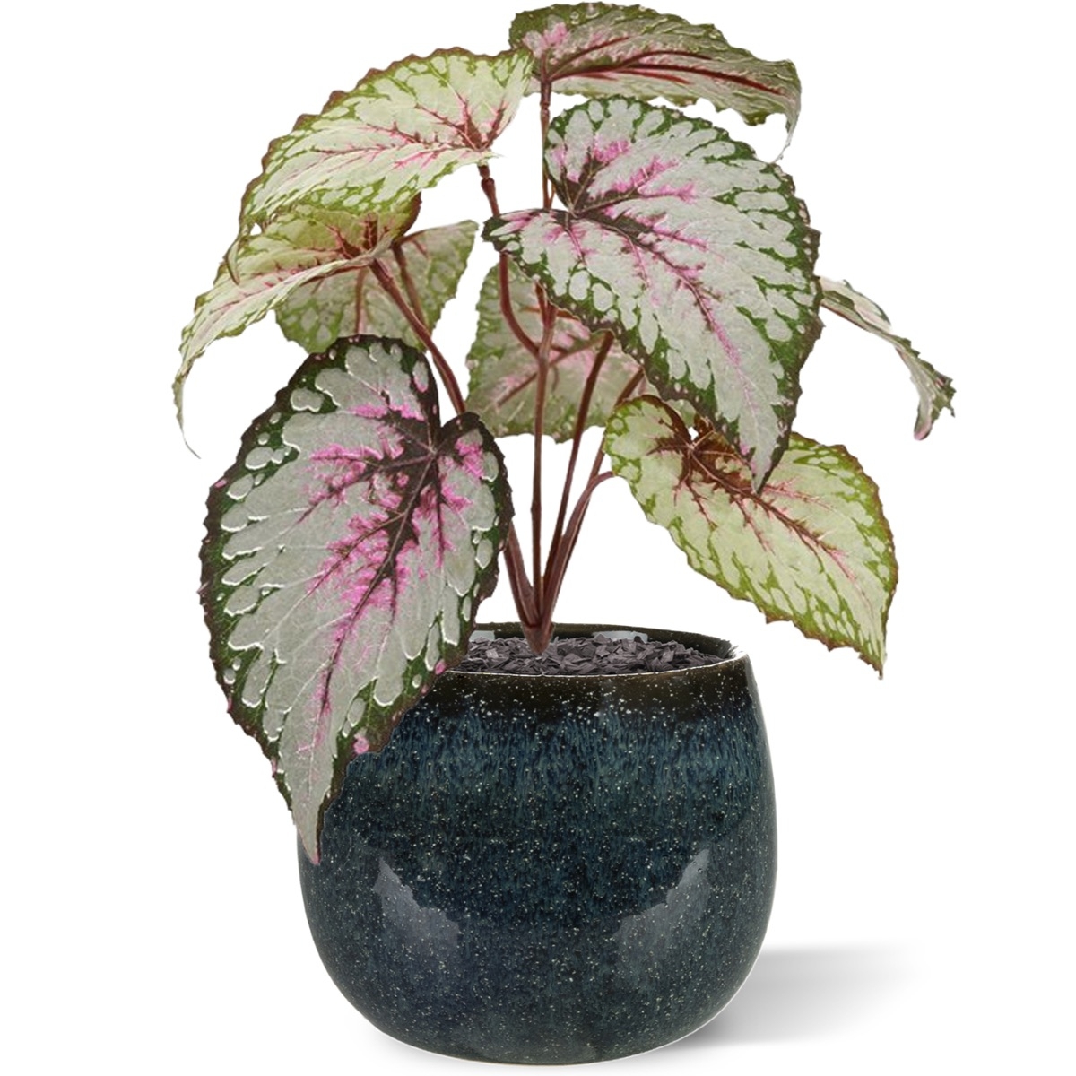Ehi, bello.... rimescolati. Accanto a quella speciale begonia a foglia (begonia rex) con foglie satinate e allegri segni fogliari, tutti vogliono stare. Guardate le venature rosa fluorescenti, le diverse tonalità di verde tutt'intorno e i bordi argentati. Un'e