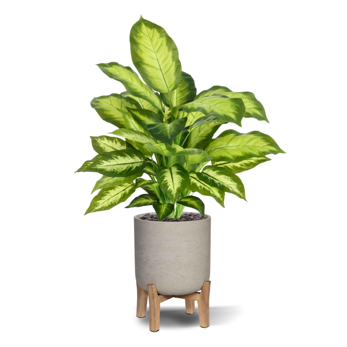 La Dieffenbachia ha splendide foglie verdi variegate. Le sue sfumature realistiche le conferiscono un aspetto fresco e naturale. Con un'altezza di 55 cm, questa pianta artificiale si adatta perfettamente a un vaso decorativo sul pavimento, su una credenza o su un ampio davanzale.