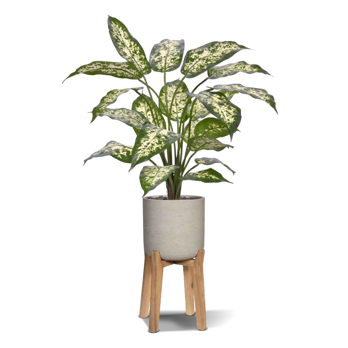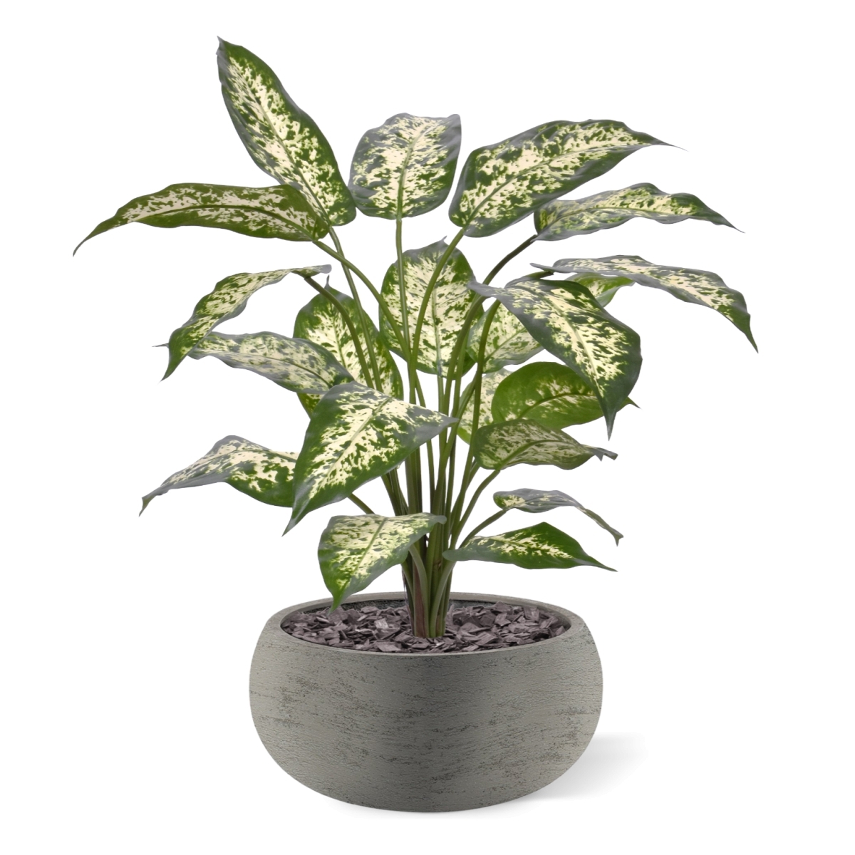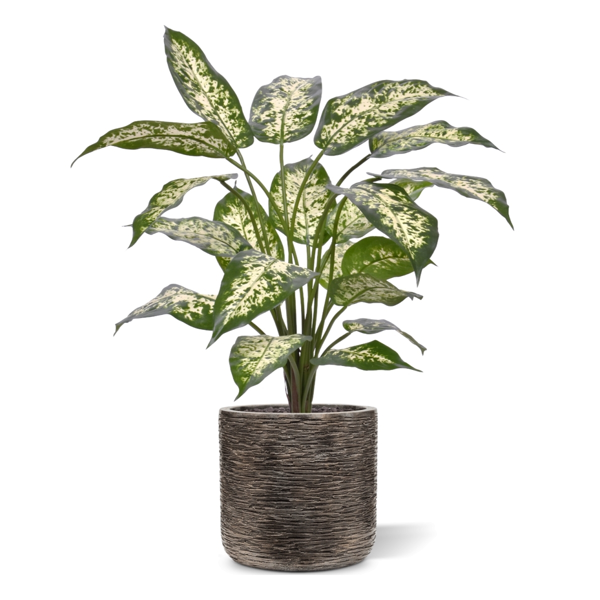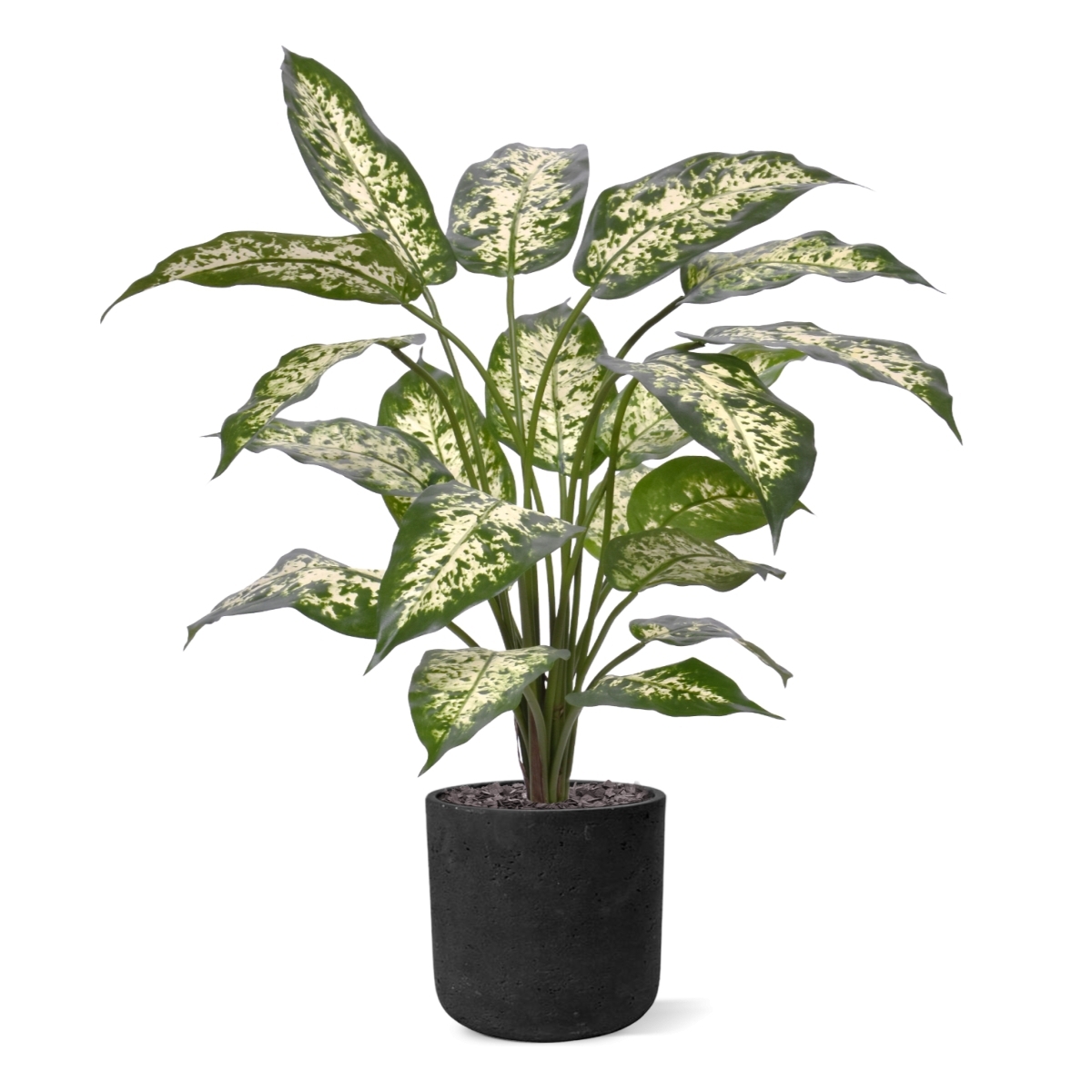 Porta l'atmosfera tropicale dell'Albero Artificiale Dieffenbachia 60cm Deluxe nella tua casa con le sue foglie verdi e crema splendidamente marmorizzate in tonalità di verde, giallo-verde e bianco. Questa pianta artificiale porta l'atmosfera tropicale del Cent