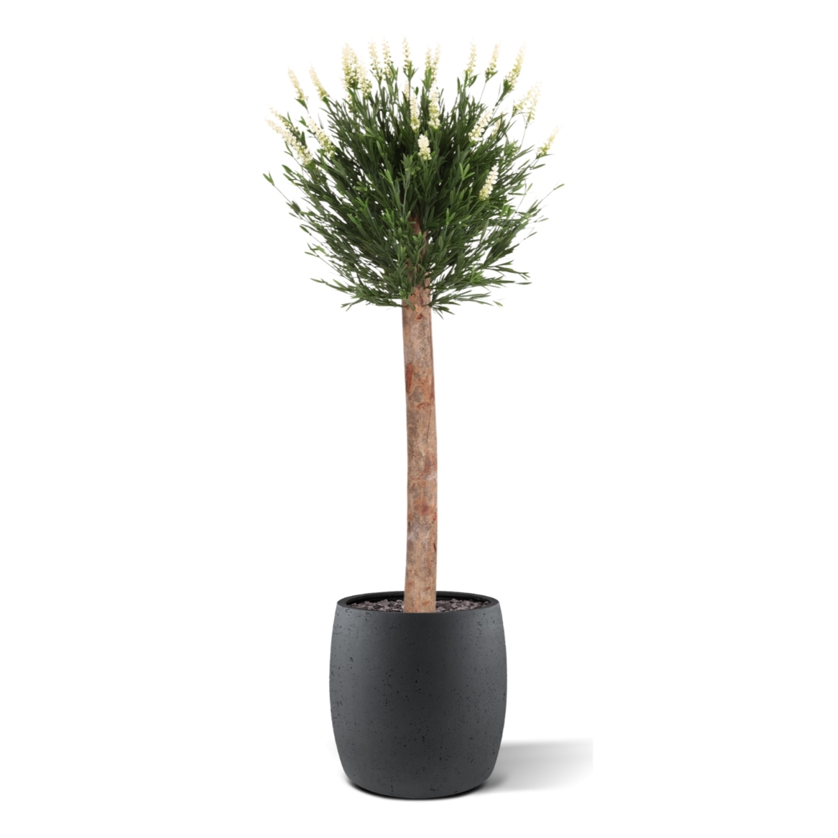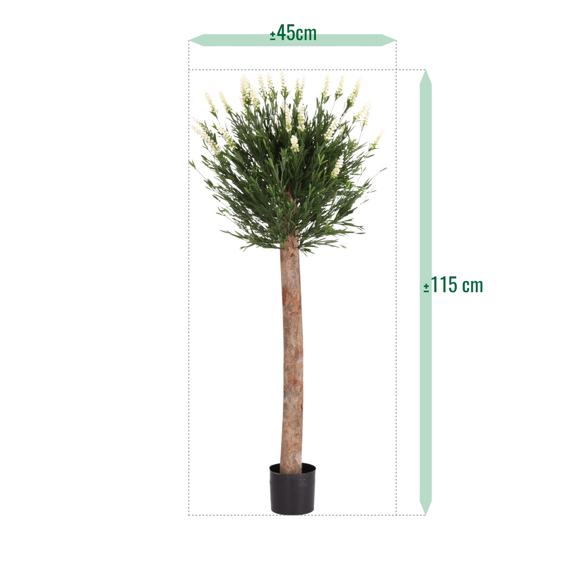 La sfera è composta da foglie dettagliate e fiori bianchi, fissati su un vero tronco di legno. Questa lavanda artificiale su tronco assomiglia moltissimo a una pianta di lavanda vera in vaso. Prima della spedizione, ogni pianta viene modellata dai nostri specialisti, garantendo una forma piena e armoniosa. I rami flessibili consentono ulteriori regolazioni dopo la consegna.