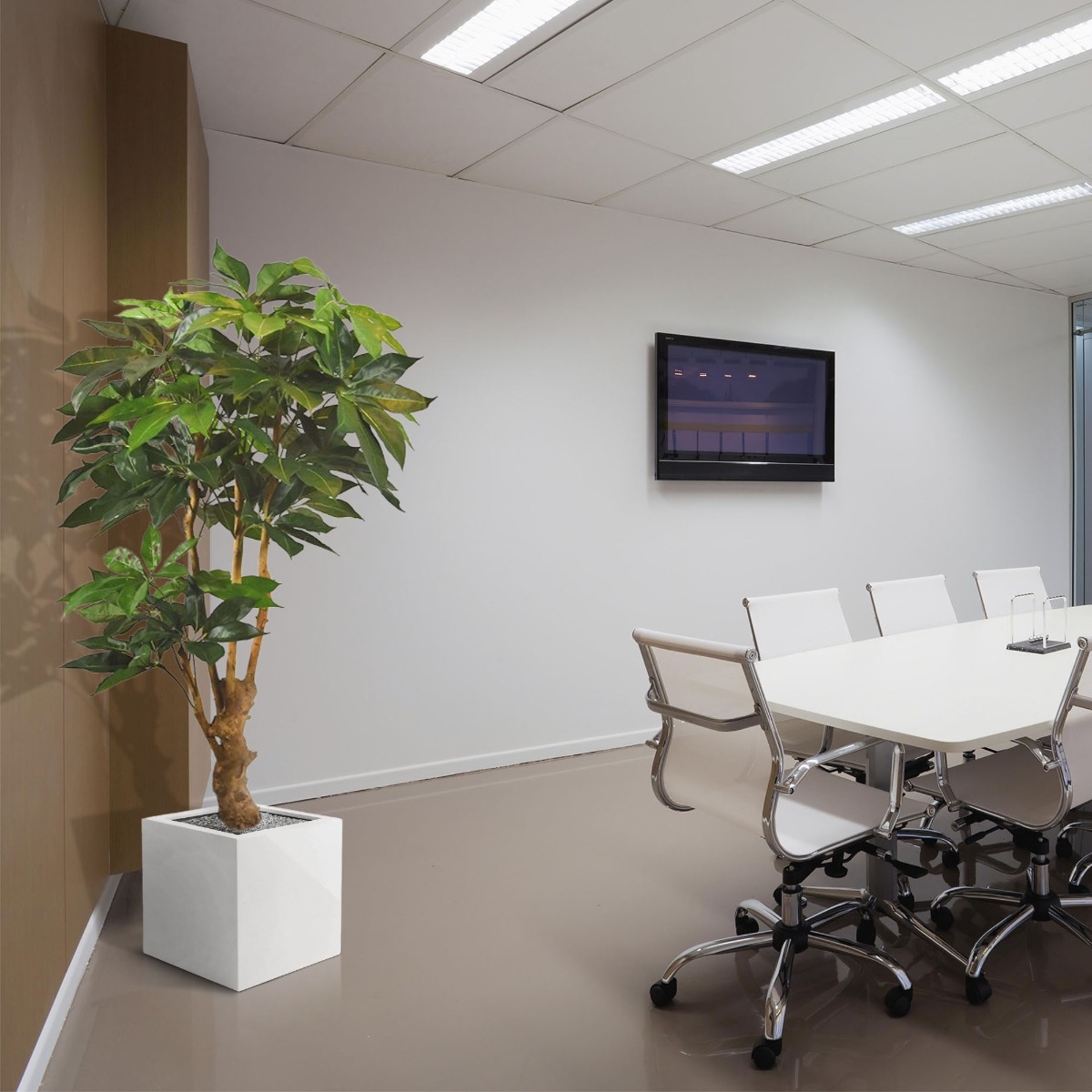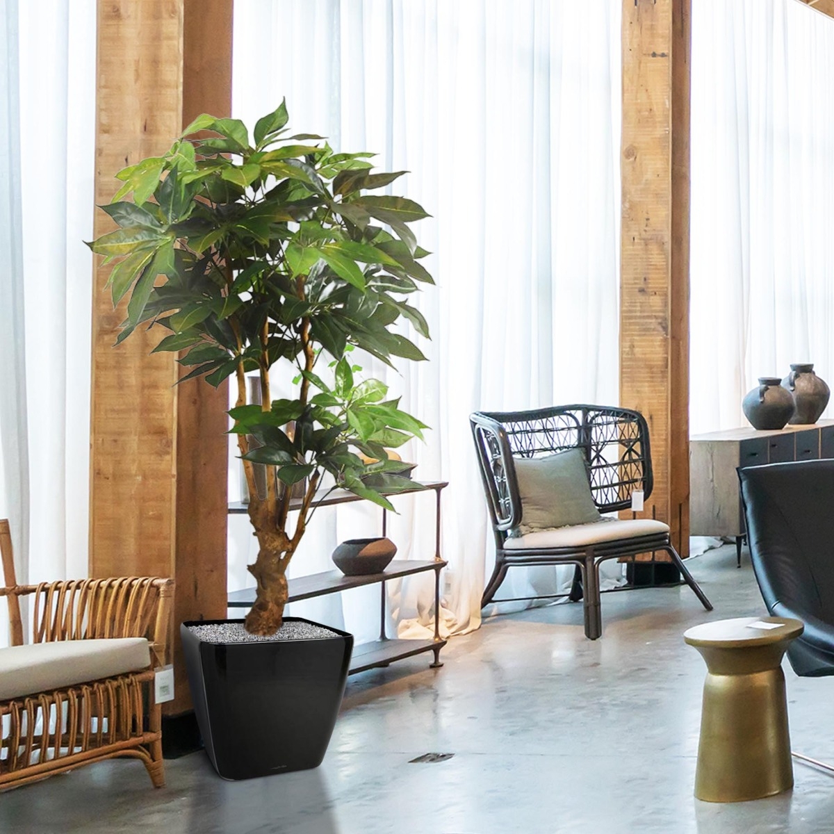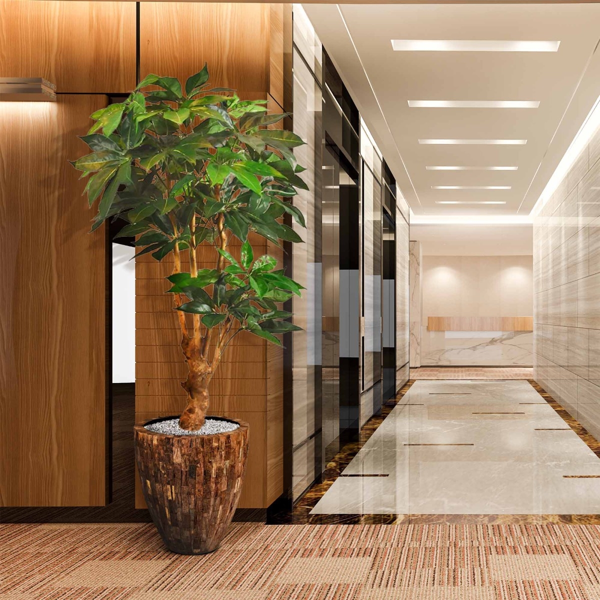 Avete già incontrato questa Schefflera Amate realistica e lussuosamente eseguita in vaso di 165 cm di altezza? Che ingresso, eh? È tutto un sorriso con la fantastica costruzione intorno al tronco di legno vero e le foglie di seta artificiale ricreate in modo s