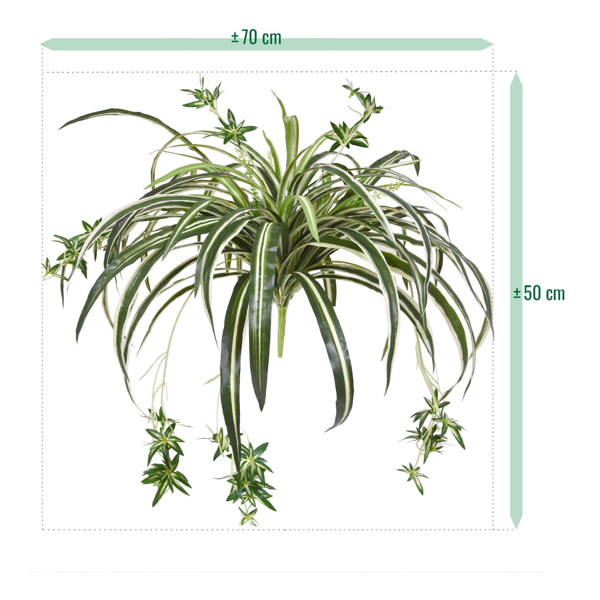 Il Chlorophytum, ma come pianta ricadente! Questa piccola pianta incredibilmente divertente e allegra, con foglie sottili e appuntite, può essere combinata con alcune piante sospese o esposta da sola. Con le sue foglie verdi e le caratteristiche strisce bianch