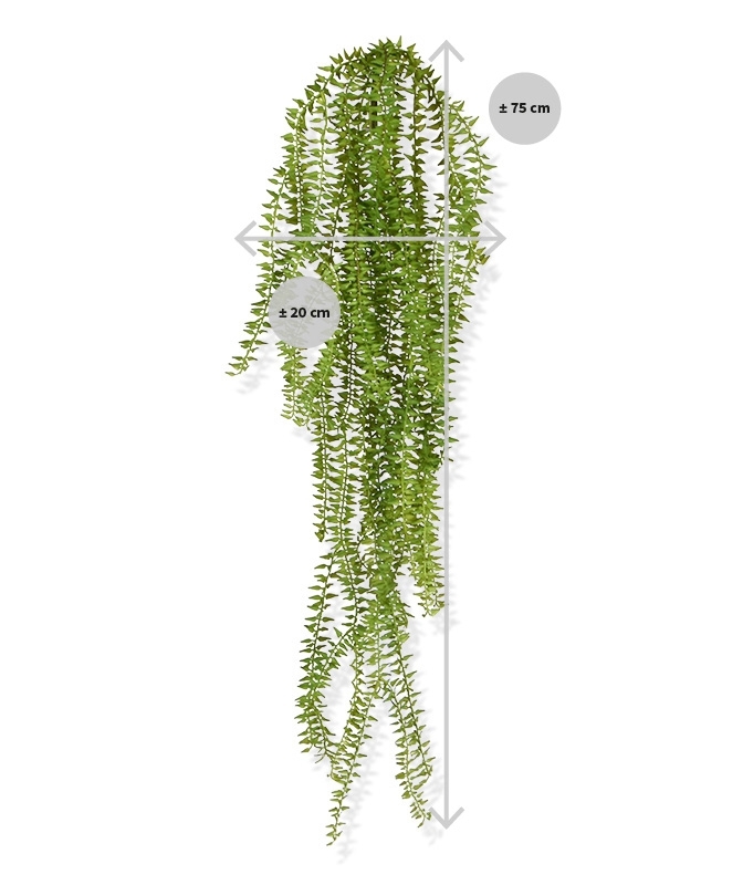 Questa pianta pensile artificiale Huperzia è lunga circa 75 cm (escluso l'adesivo) e larga 15 cm e viene fornita di serie con un adesivo. Con questo si può facilmente inserire la pianta in un vaso ornamentale o incorporarla in una composizione creativa. Questo ciondolo è stato fuso da un unico stampo per un risultato solido come una roccia. La struttura pieghevole consente di modellare la pianta come si desidera.