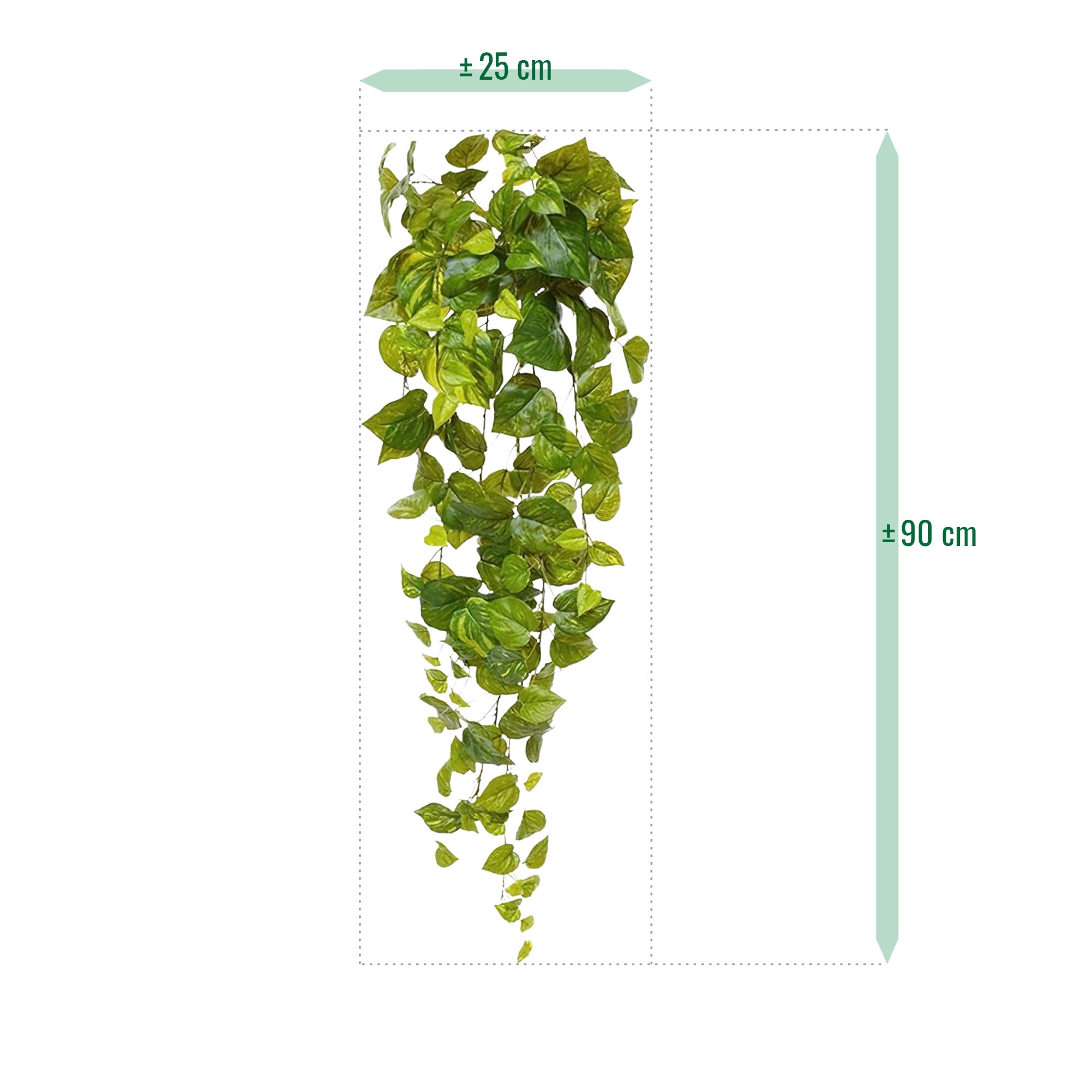 La lunghezza totale del pothos artificiale in forma pendente, compreso lo stelo, è di circa 90 cm e la larghezza di 25 cm.