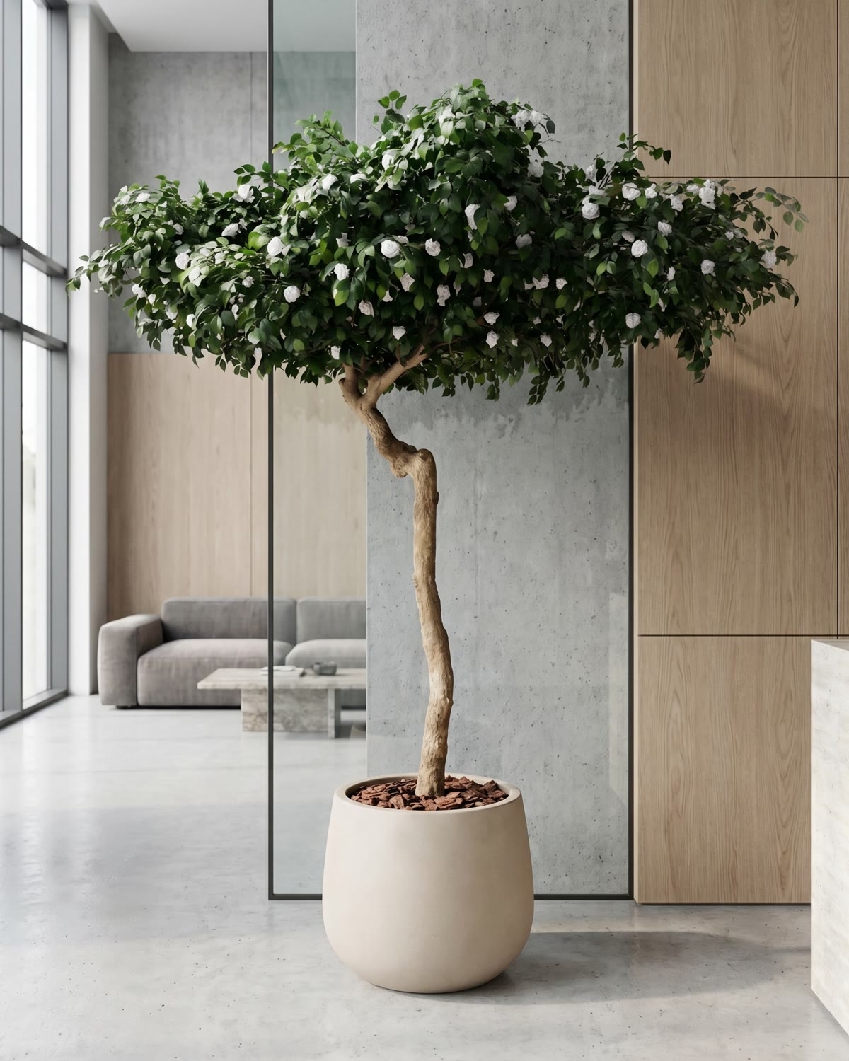 Lo splendido ramo di Camelia può essere montato sul tronco Umbrella, il vero tronco della Pianta del Caffè, la cui caratteristica principale è rappresentata dalle ramificazioni estese che permettono di agganciare altri rami fino a raggiungere diametri di ampiezza considerevole, rendendo così possibile la creazione di una pianta con la tipica chioma a “ombrello”. Il tronco Umbrella è un tronco elegante i cui nodi si presentano sgranati come perle preziose lungo tutta la sua lunghezza. Il suo diametro è compreso tra i 12 e i 18 cm. Ciascuno tronco Umbrella è, proprio come in natura, unico e si distingue presentando caratteristiche proprie che lo rendono inconfondibile nelle sue curve sinuose, nelle sfumature di colore, nella posizione dei nodi e delle ramificazioni. I rami vengono installati uno a uno dai nostri esperti artigiani che, in base alle vostre esigenze e indicazioni, daranno così vita ad un esemplare irripetibile: potrete, infatti, anche scegliere l’altezza della vostra pianta, la misura del diametro della chioma e persino la sua forma. Una volta che la pianta sarà stata consegnata, non dimenticate, di aprirne i rami, e, in ultimo, di modellarli e piegarli nella posizione desiderata.