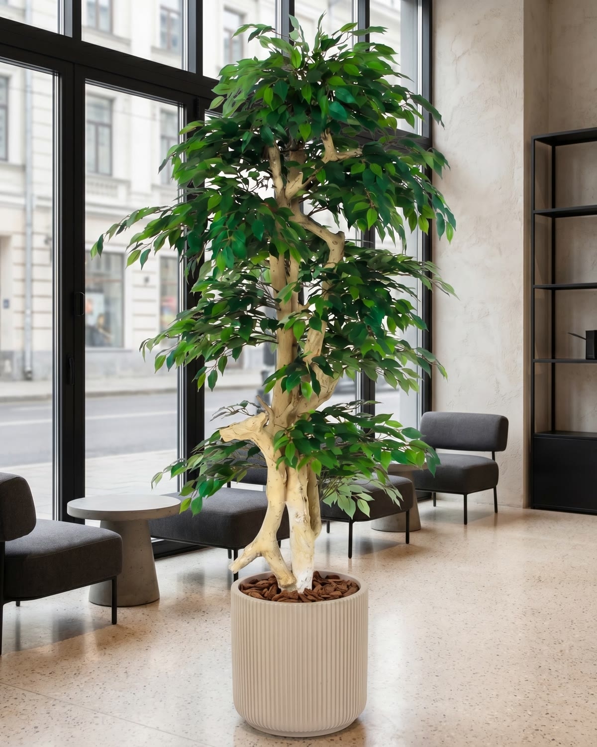 Lo splendido ramo di Ficus può essere montato sul tronco Japan, un tronco naturale suggestivo che rievoca paesaggi giapponesi e giardini zen. Il suo fusto è stretto e le sue ramificazioni rimandano alla struttura tipica dei bonsai giapponesi a palchi. Il tronco Japan è sprovvisto di corteccia e, per questo, è liscio, chiaro e presenta le sfumature tenui del beige e del marrone chiaro. Ciascuno tronco Japan è, proprio come in natura, unico e si distingue presentando caratteristiche proprie che lo rendono inconfondibile nelle sue curve sinuose, nelle sfumature di colore, nella posizione dei nodi e delle ramificazioni. I rami vengono installati uno a uno dai nostri esperti artigiani che, in base alle vostre esigenze e indicazioni, daranno così vita ad un esemplare irripetibile: potrete, infatti, anche scegliere l’altezza della vostra pianta, la misura del diametro della chioma e persino la sua forma. Una volta che la pianta sarà stata consegnata, non dimenticate, di aprirne i rami, e, in ultimo, di modellarli e piegarli nella posizione desiderata.
