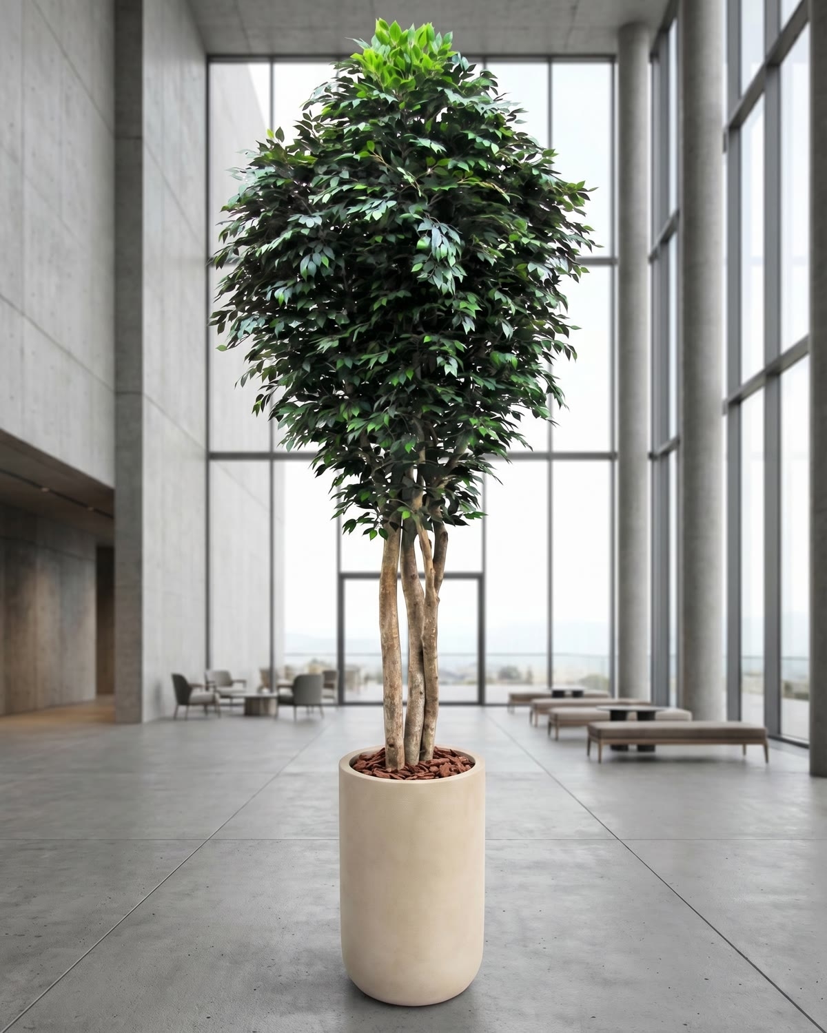 Il Ficus Giant seminaturale è una pianta di grande effetto, disponibile in altezze imponenti tra 3,5 e 5 metri, pensata per spazi molto ampi come hall, atri, gallerie o locali commerciali. È una pianta “seminaturale”: il tronco è autentico, mentre il fogliame