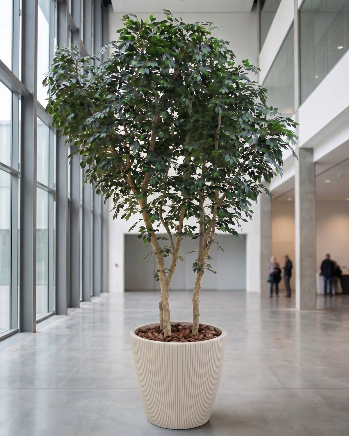 Lo splendido ramo di Ficuspuò essere montato sul tronco Mansanisi Giant Bosco. Per costruire questo modello si utilizzano diversi tronchi naturali Mansanisi, il cui diametro può variare tra i 6 cm. e i 14 cm. I tronchi presentano numerose ramificazioni, prevalentemente lineari, ma nessun nodo, e le sfumature del beige e dell’ocra. In questo modello, i tronchi Mansanisi vengono fissati in una piastra a 3 o 4 bicchieri, in modo tale che gli stessi possano essere allargati e posizionati ad hoc per ottenere l’effetto Bosco che solo una pianta imponente, fitta, frondosa e con una chioma che raggiunge un diametro ragguardevole può creare.