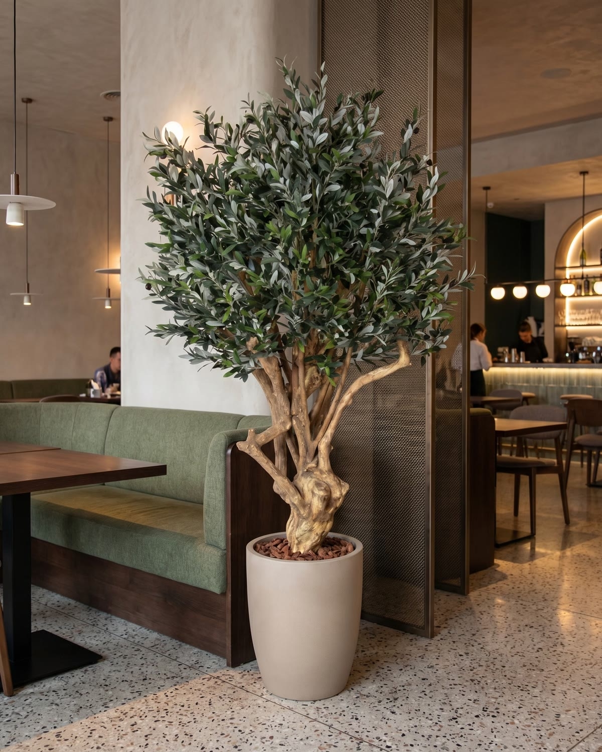 L’Olivo Artificiale è una delle specie che più ci richiedono tanto in Europa, quanto negli UAE e in America. Le foglie sono riproduzioni dettagliate e fedeli delle foglie vere di Olivo, sia per il loro colore grigio-verde che per la loro forma stretta e lanceolata: la punta di alcune foglie presenta addirittura la tipica sfumatura marrone, caratteristica delle foglie di questa specie, simbolo trascendentale di spiritualità e sacralità, presente nella simbologia e nei miti fin dalla Preistoria. Sui rami sono presenti anche alcune olive nere, che, su richiesta del cliente, possono essere tagliate. Parimenti, la chioma può essere costruita centrale rispetto al tronco, sbilanciata a destra o a sinistra e nelle proporzioni richieste in modo da potersi adattare a qualunque spazio di qualunque dimensione, creando l’effetto desiderato. Disponibili anche nella versione Luxe e nella versione UVR, i rami di ulivo possono essere installati su ciascun tronco della Collezione . Una presenza evocativa che, all’ingresso di un salotto, in una sala riunioni, nella hall di un hotel, in una sala ristorante, in un angolo a tema, ma anche in un giardino, in un patio, negli spazi all’aperto di un resort, nei centri commerciali, vi sarà impossibile dimenticare