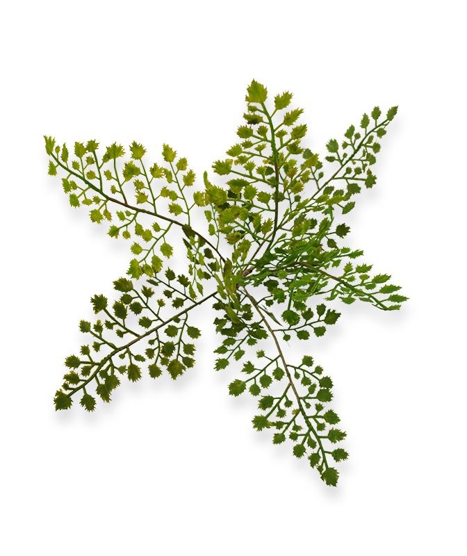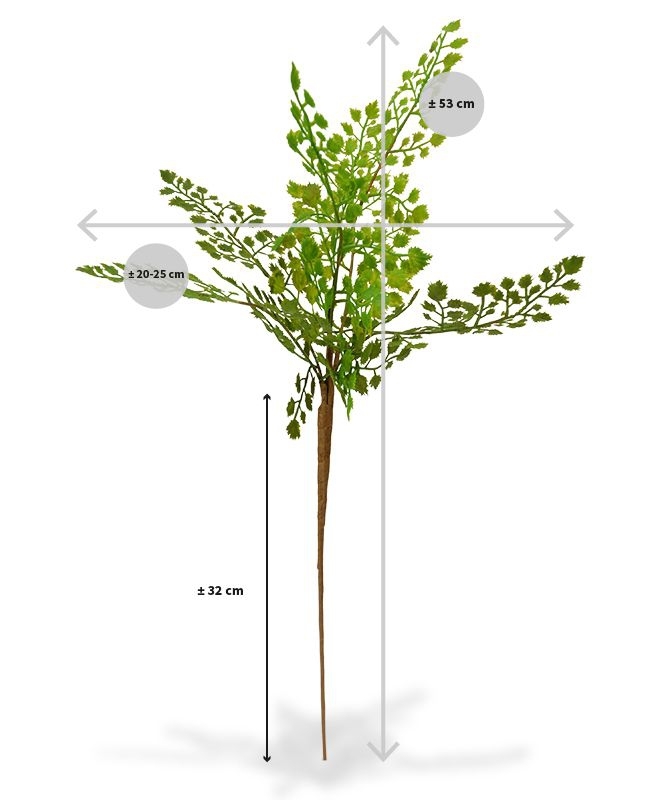 La pianta artificiale Adiantum, detta anche Capelli di Venere, è una modesta pianta d'appartamento e appartiene alla famiglia delle felci. Questa pianta tozza viene spesso inserita in composizioni e allestimenti floreali. Questo ramo artificiale è composto da
