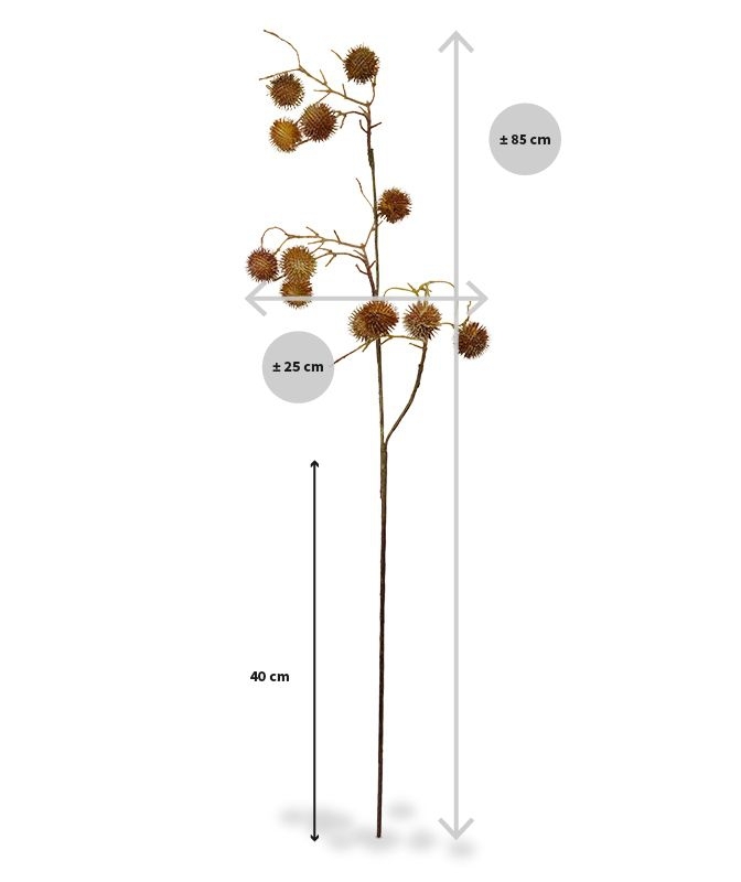 Questo bellissimo ramo artificiale di cardo verde è una copia del vero ramo di cardo. Il ramo artificiale è composto da uno stelo con molti rami laterali e 12 bulbi di cardo perfettamente imitati, dotati di aculei. Il ramo artificiale di cardo è fornito come s