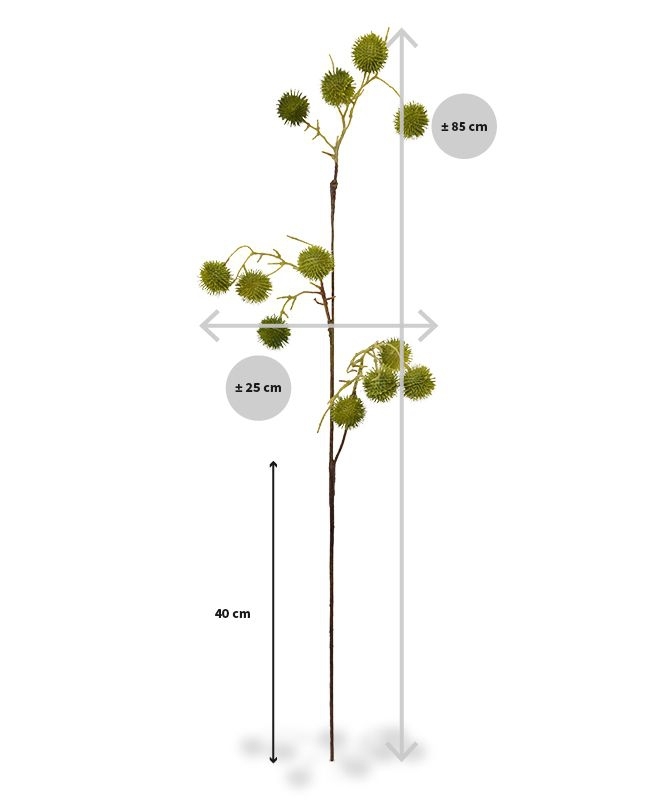 Questo bellissimo ramo di cardo artificiale è una replica del vero Carduus. Il ramo finto è composto da uno stelo con più rami laterali, 12 sfere di cardo verde perfettamente contraffatte con molte punte. Per impostazione predefinita, il ramo di cardo finto vi