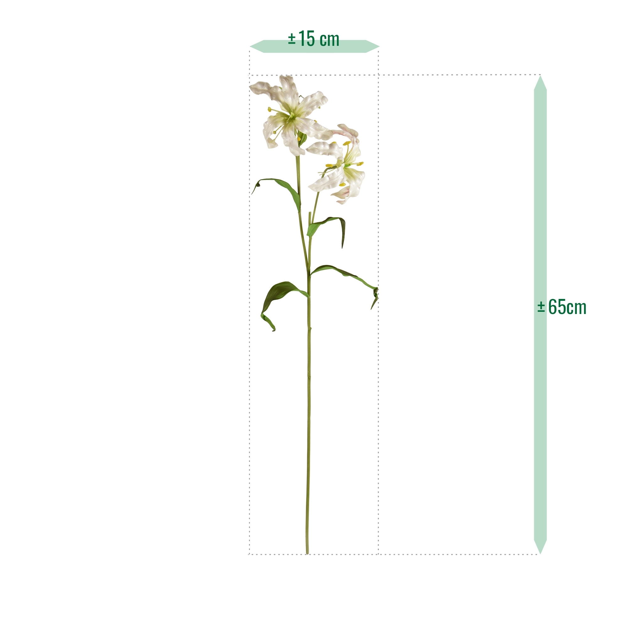 La Gloriosa branch deluxe crema/rosa, chiamata anche giglio rampicante, appartiene alla famiglia dei gigli (Liliaceae) e viene consegnata come fiore a stelo libero. In combinazione con altri fiori artificiali, è possibile incorporare la Gloriosa in colorati bo