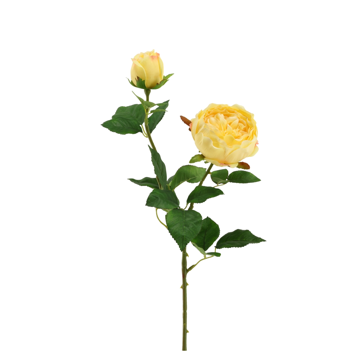 La Rosa da Giardino Inglese Artificiale 69cm - Gialla è un’elegante e affascinante aggiunta a qualsiasi ambiente interno. Questa rosa artificiale presenta un fiore completamente aperto e un bocciolo appena sbocciato, offrendo un aspetto dinamico e naturale. Ci